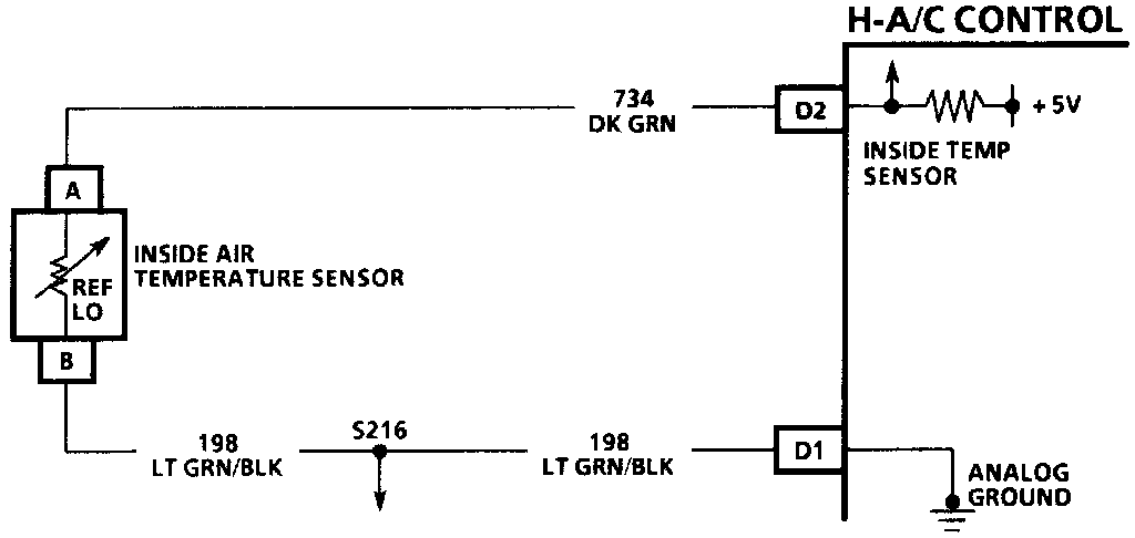 The inside air temperature sensor is a thermistor used to control the signal voltage at the H-A/C control. The H-A/C control supplies a reference voltage (about 5 volts) on CKT 734 to the sensor When the inside air temperature is cold, the thermistor resistance is high; therefore, the H-A/C control will receive a high signal voltage input. If the inside air temperature is hot, the thermistor resistance is low; therefore the H-A/C control will receive a low signal voltage input.