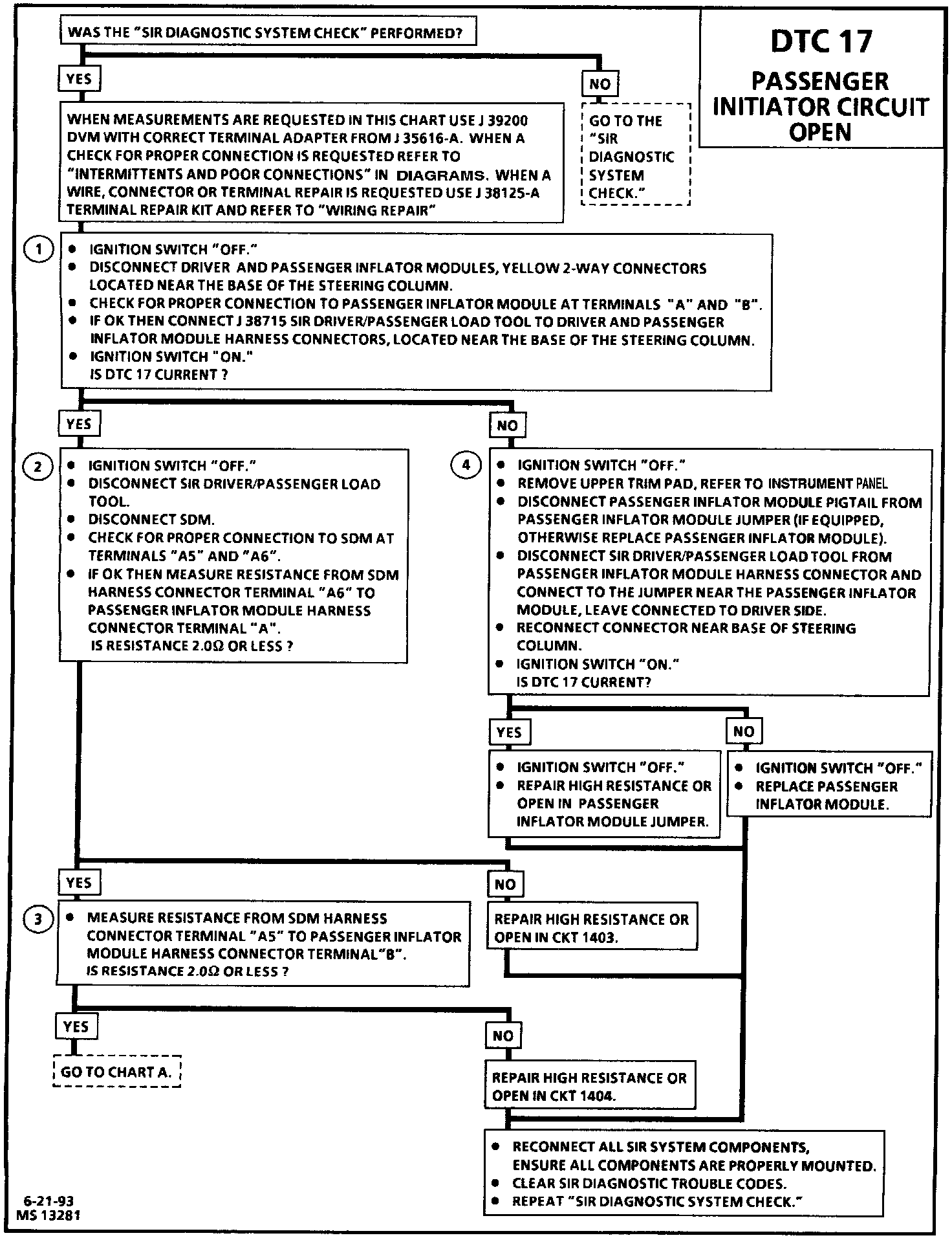 An intermittent condition is likely to be caused by a poor connection at the passenger inflator module harness connector terminals "A" and "B," SDM terminals "A5" and "A6", or an open in CKT 1403 or CKT 1404.