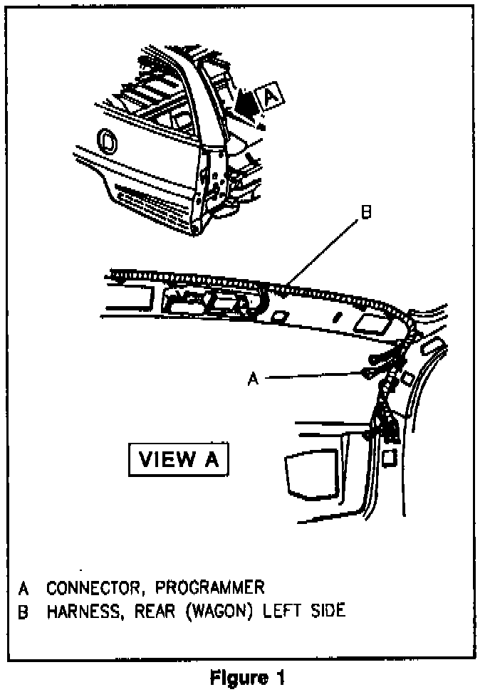 The correct location for the remote keyless entry system programming connector is behind the left back body pillar finish panel (left "D" pillar). The service manual incorrectly states the right side.