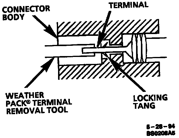 Insert the Weather Pack(R) terminal removal tool into the front (mating end) of the connector cavity until it rests on the cavity shoulder.