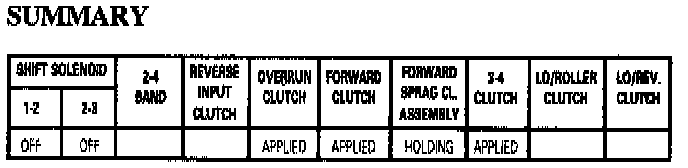 In Manual Third the transmission upshifts and downshifts normally between First, Second and Third gears. However, in First and Second gears, the 2-3 shift solenoid is energized and the 2-3 shift valve train is in the downshifted position. The 2-3 shuttle valve blocks D3 fluid from entering the overrun fluid circuit and opens the overrun fluid circuit to an exhaust port at the valve. This prevents overrun clutch apply and engine compression braking in Manual Third - First and Second Gears.