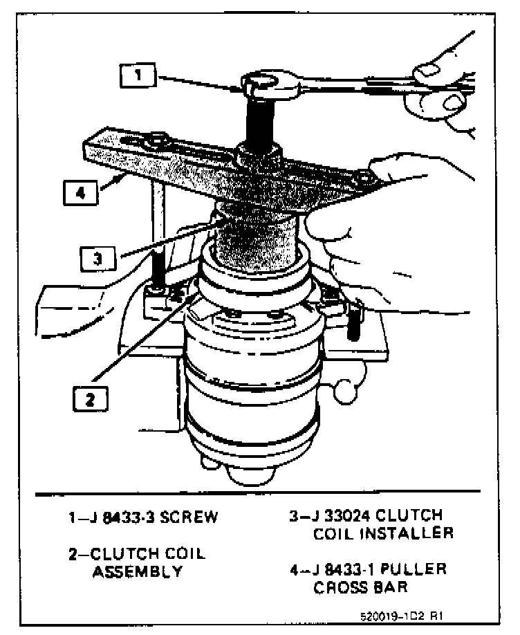4. Turn the center forcing screw of the J 8433-1 puller crossbar to force the clutch coil onto the front head. Be sure clutch coil and J 33024 installer stay in-line during installation.