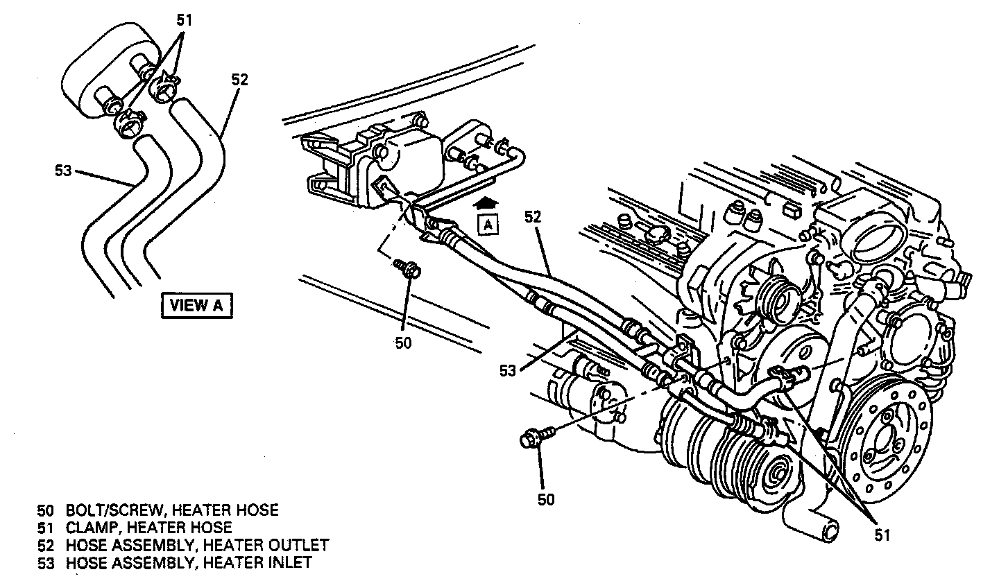 3. Heater outlet and inlet hose assemblies (52 or 53) to heater core.