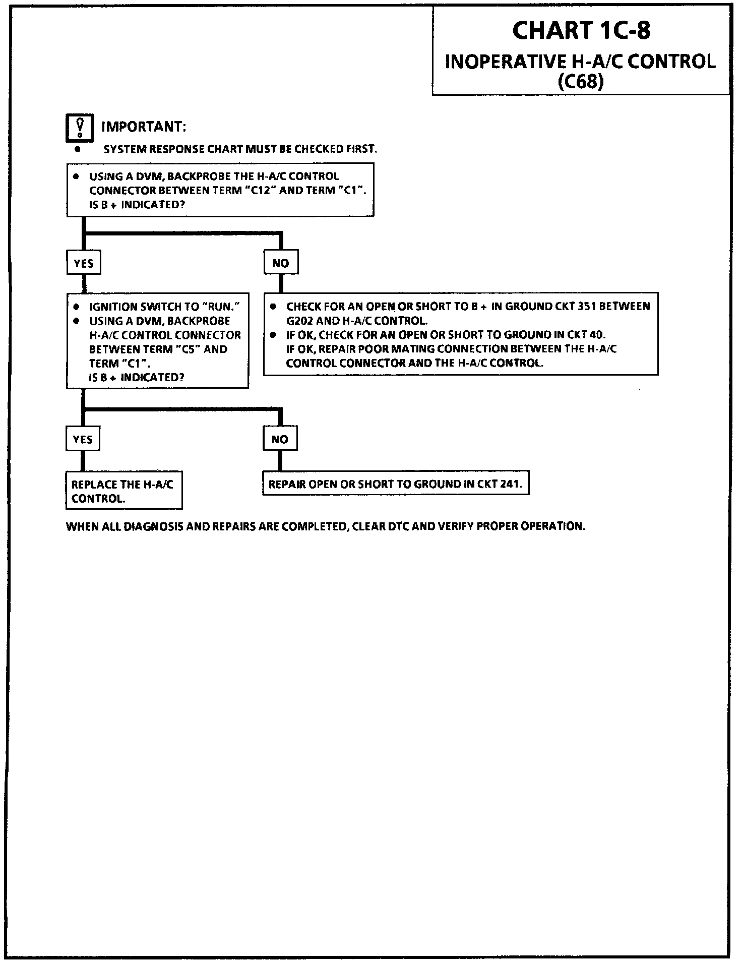 The H-A/C control receives battery voltage at all times through CKT 40. This input is used to retain the volatile memory of the H-A/C control. CKT 241 is an ignition input used to wake up" the H-A/C control, CKT 351 supplies ground to the H-A/C control.