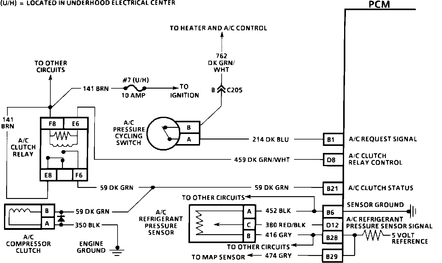This signal tells the PCM that the A/C selector switch in turned "ON". The PCM uses this information to adjust idle speed when the A/C is working. If this signal is not available to the PCM, the A/C compressor will not engage.
