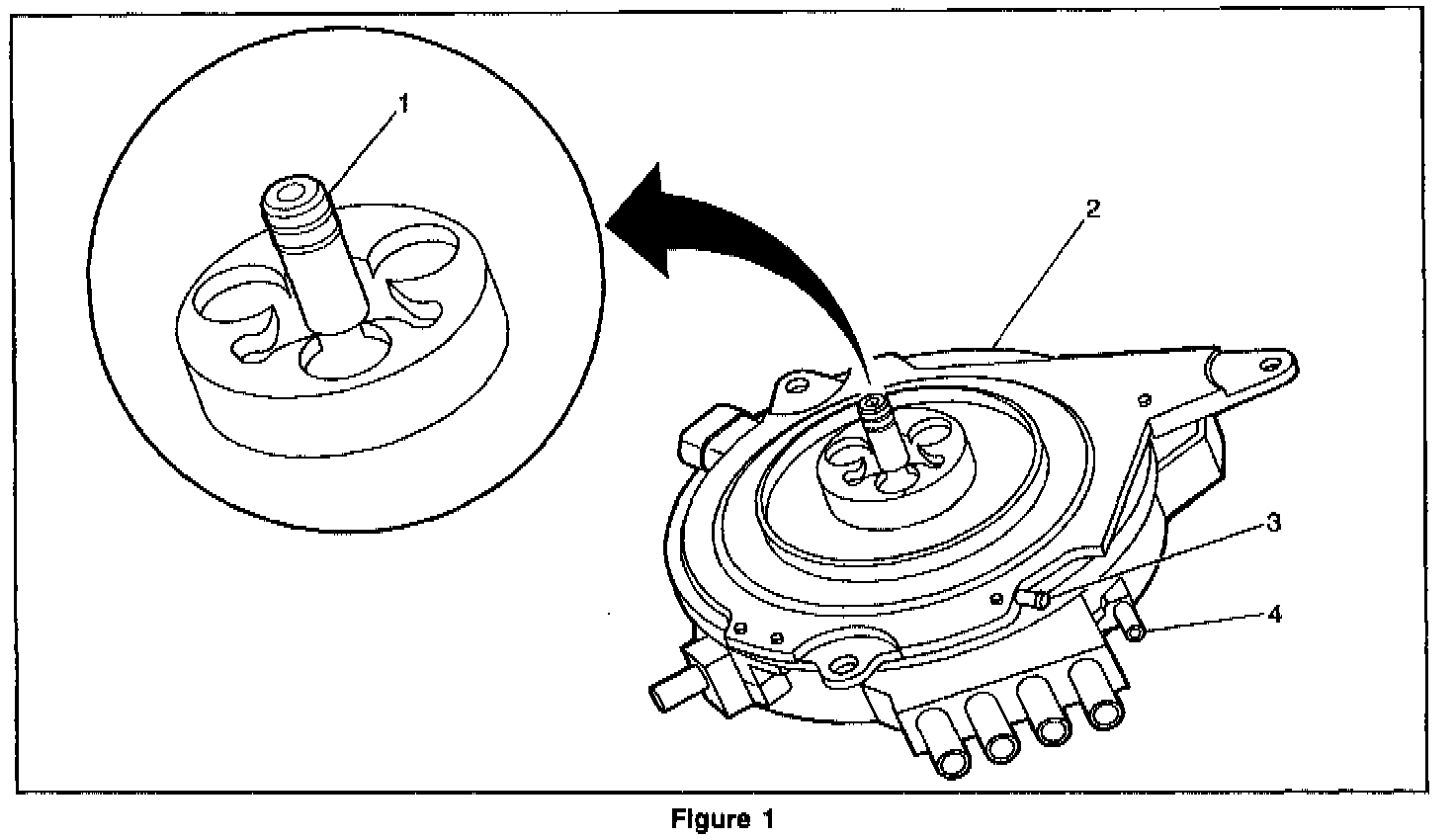 2. Opti-Spark Distributor I (Splined Drive - WITHOUT positive vent system) can be identified by the splined pin drive (1), or the lack of intake manifold vacuum hose connection and air intake duct hose connection. Refer to Figure 2.