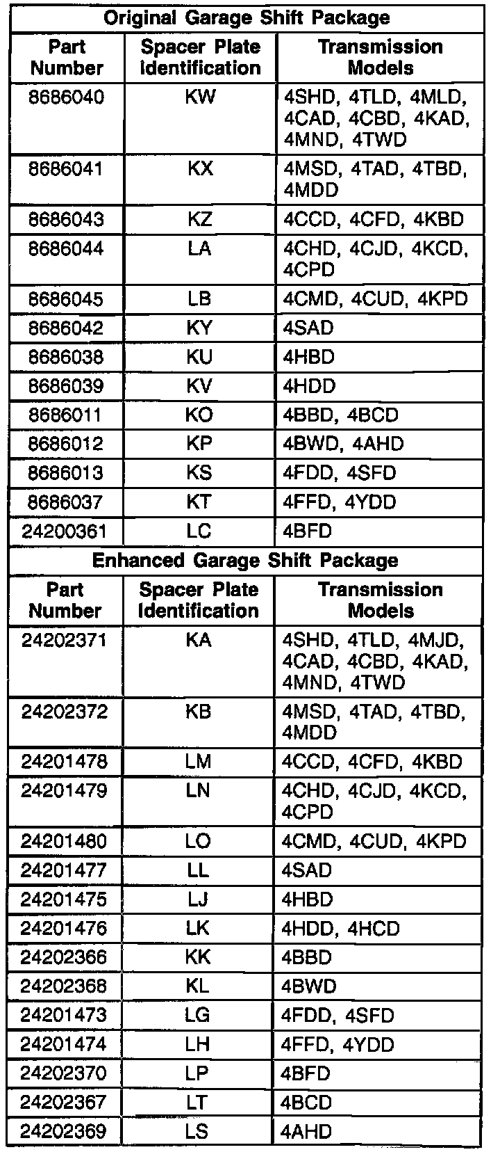 The transmission spacer plate must also be replaced with an enhanced garage shift package spacer plate, consult your parts catalog for the proper spacer plate part number.