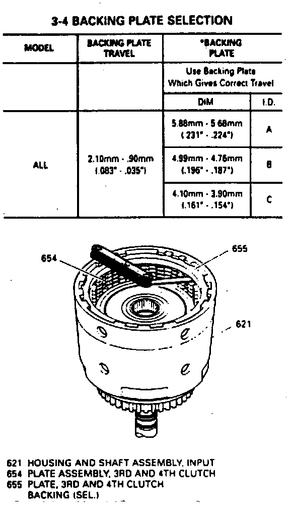 1. Check end clearance between the backing plate and first composition plate with a feeler gauge. The measurement must be taken between the 3rd and 4th clutch plate assembly and the 3rd and 4th clutch backing plate.