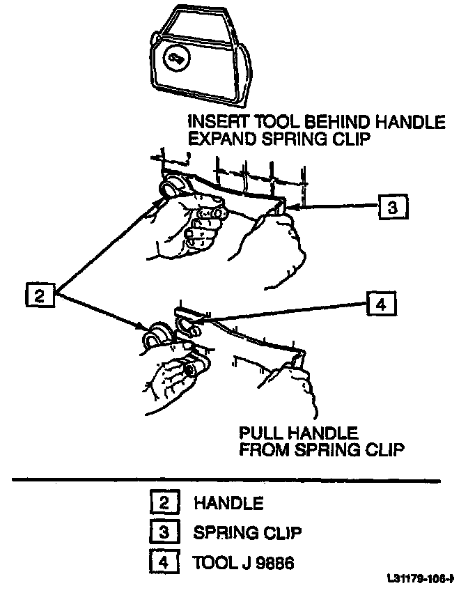 1. Spring clip by inserting tool J 9886 between handle and trim panel.