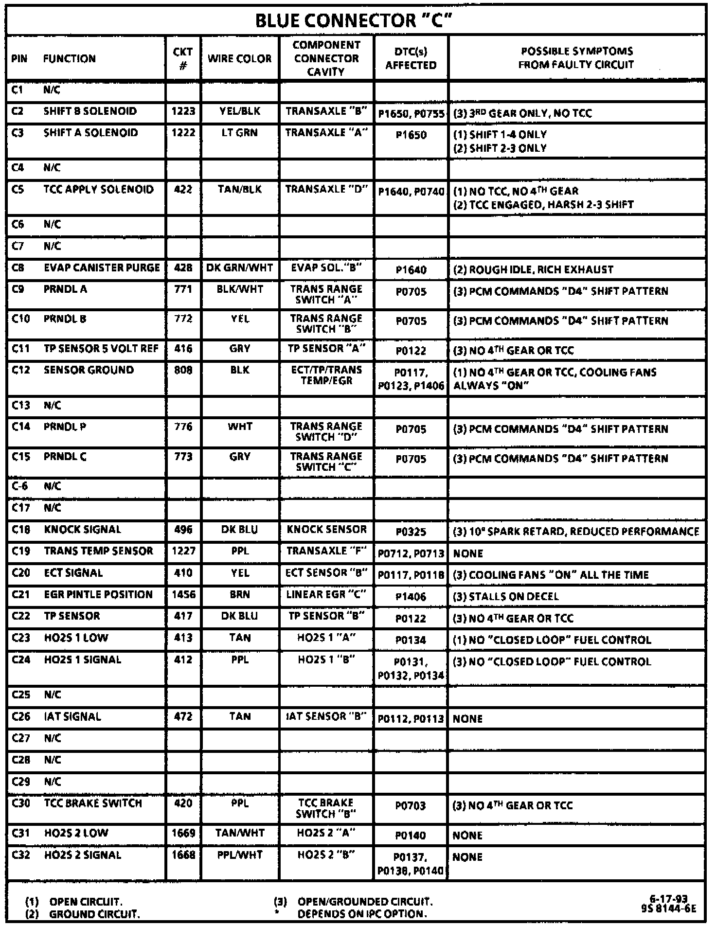 PCM Connector Circuit Failure/Symptom Chart (Blue Connector "C"):