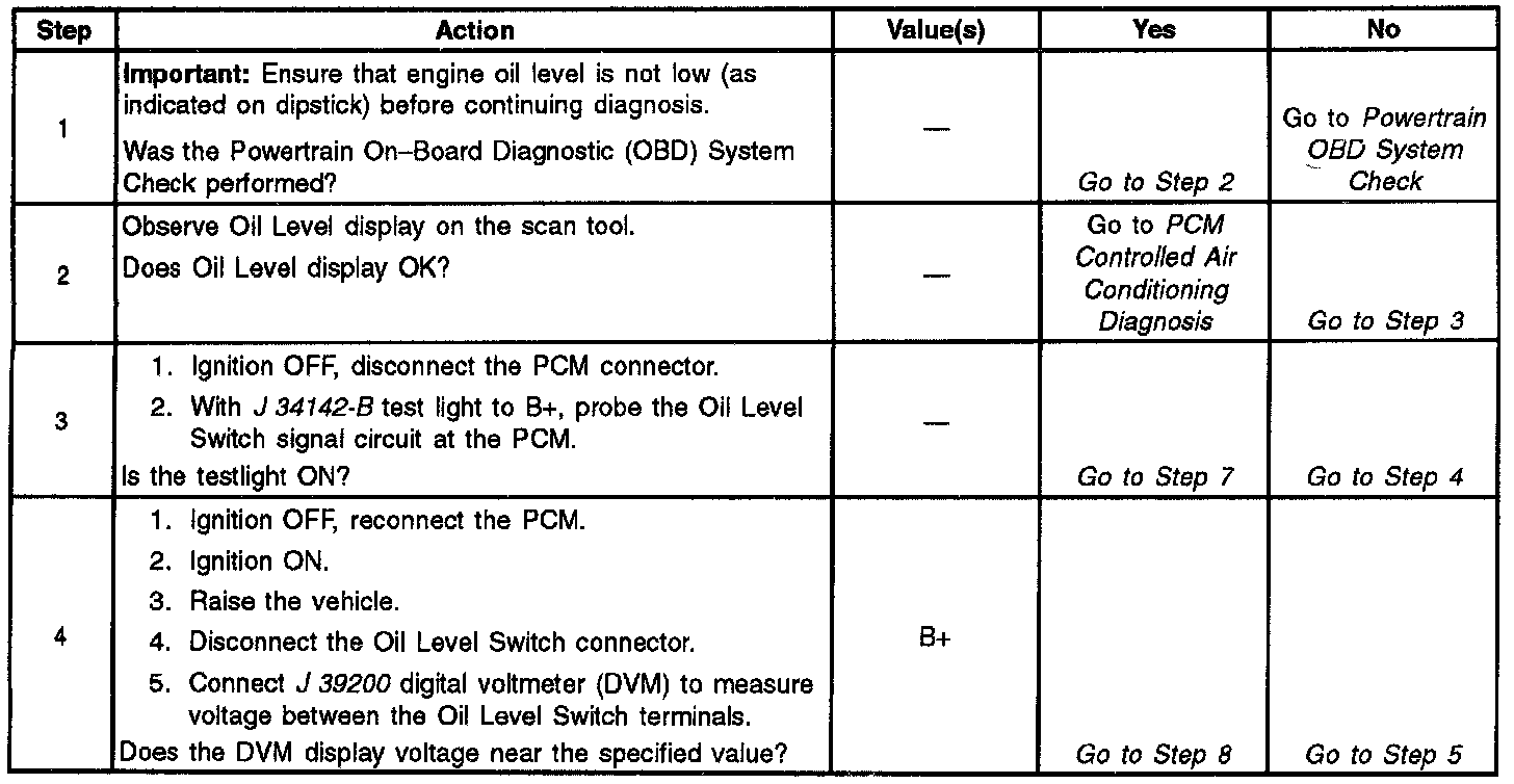 ^ Poor connection at PCM or oil level sensor. Inspect harness connectors for backed out terminals, improper mating, broken locks, improperly formed or damaged terminals, and poor terminal to wire connection.
