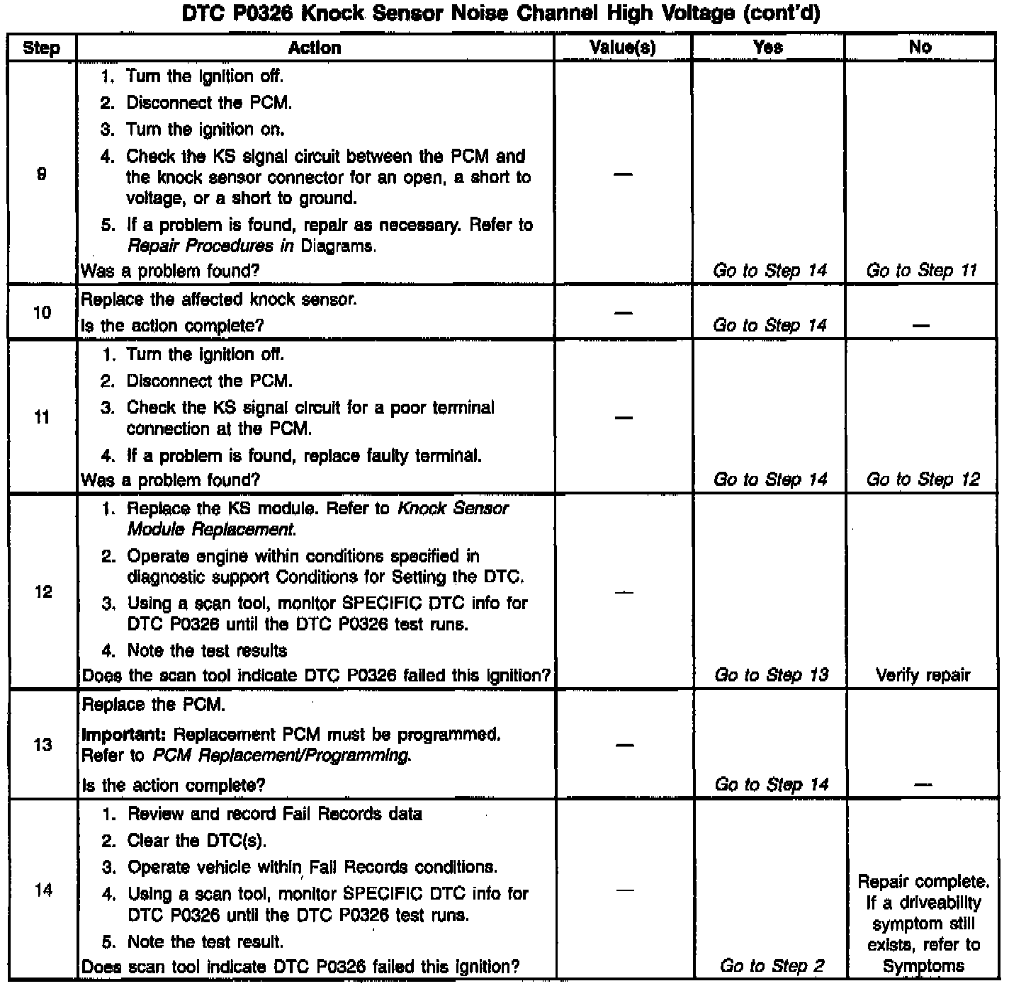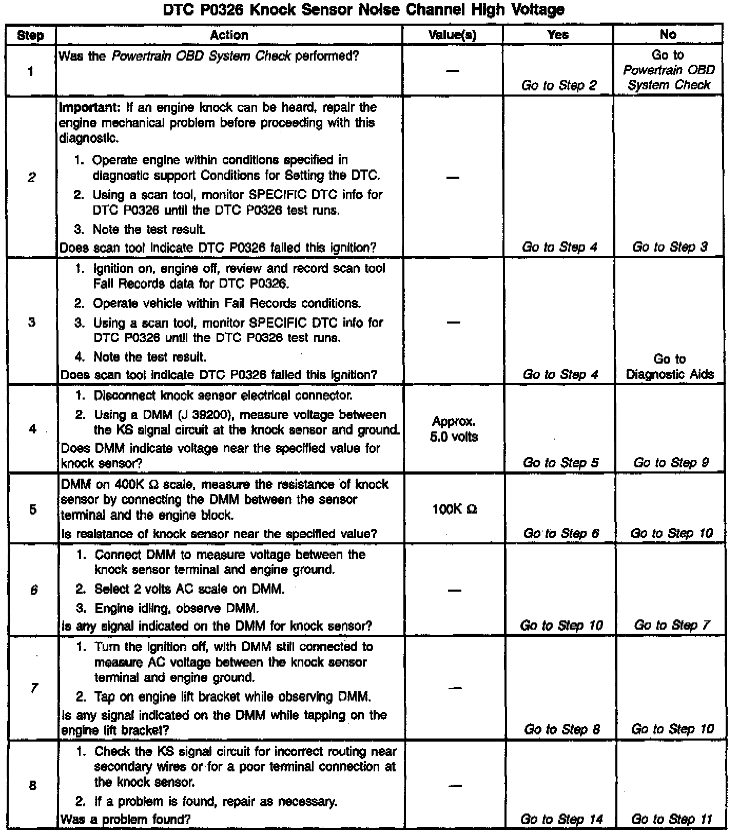 The PCM determines whether knock is occurring by comparing the signal level on the KS circuit with the voltage level on the noise channel. The noise channel allows the PCM to reject any false knock signal by indicating the amount of normal engine mechanical noise present. Normal engine noise varies depending on engine speed and load. When the PCM determines that an abnormally high noise channel voltage level is being experienced, a DTC P0326 will set.