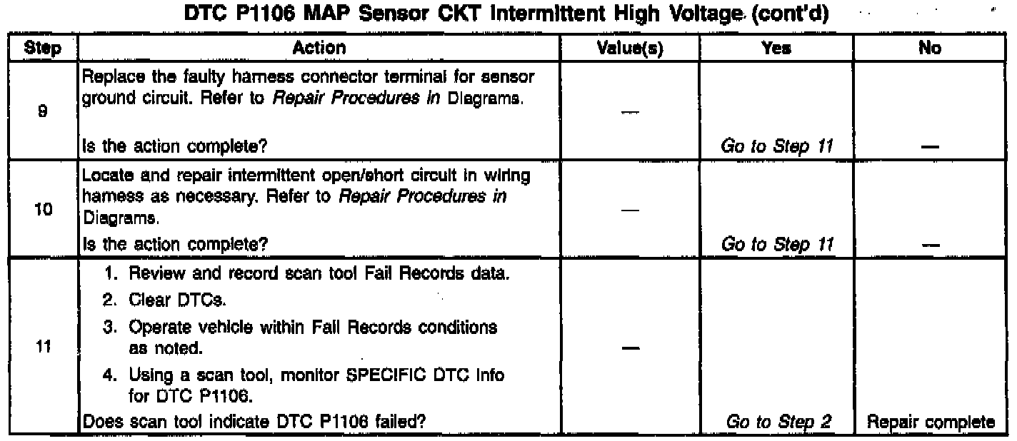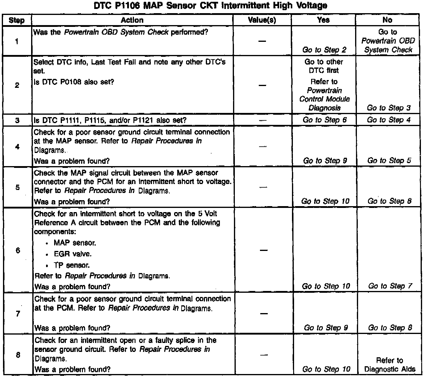 The MAP sensor is used to determine manifold pressure changes while the linear EGR flow test diagnostic is being run (refer to DTC P0401), to determine engine vacuum level for some other diagnostics and to determine barometric pressure (BARO). The PCM monitors the MAP signal for voltages outside the normal range of the MAP sensor. If the PCM detects a MAP signal voltage that is intermittently high, DTC P1106 will be set.