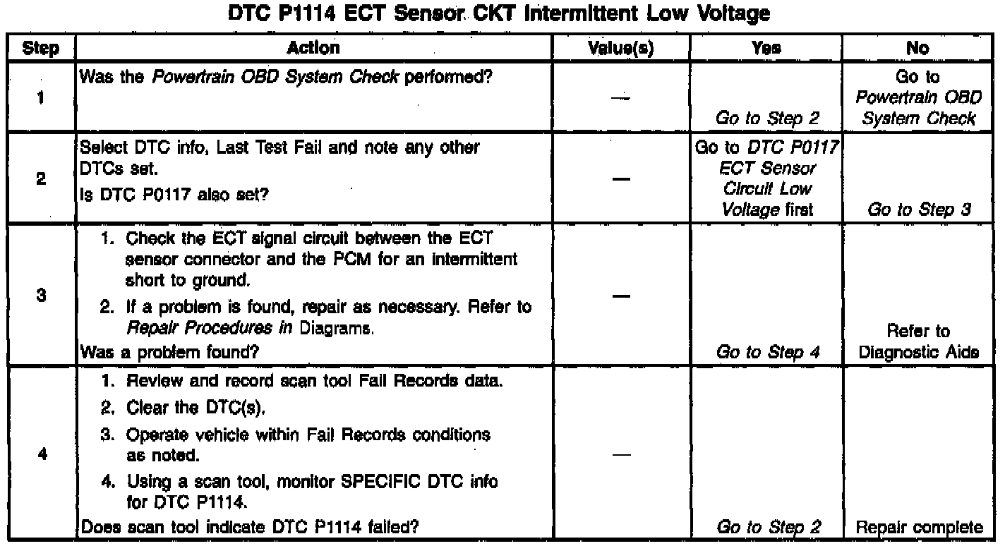 The Engine Coolant Temperature (ECT) sensor is a thermistor mounted in the engine coolant stream. The PCM applies a voltage (about 5.0 volts) through a pull up resistor to the ECT signal circuit. When the engine coolant is cold, the sensor (thermistor) resistance is high therefore the PCM will measure a high signal voltage. As the engine coolant warms, the sensor resistance becomes less, and the ECT signal voltage measured at the PCM drops. With a fully warmed up engine, the ECT signal voltage should measure about 1.5 to 2.0 volts. If the PCM detects an ECT signal that is intermittently below the range of the ECT sensor, DTC P1114 will set.
