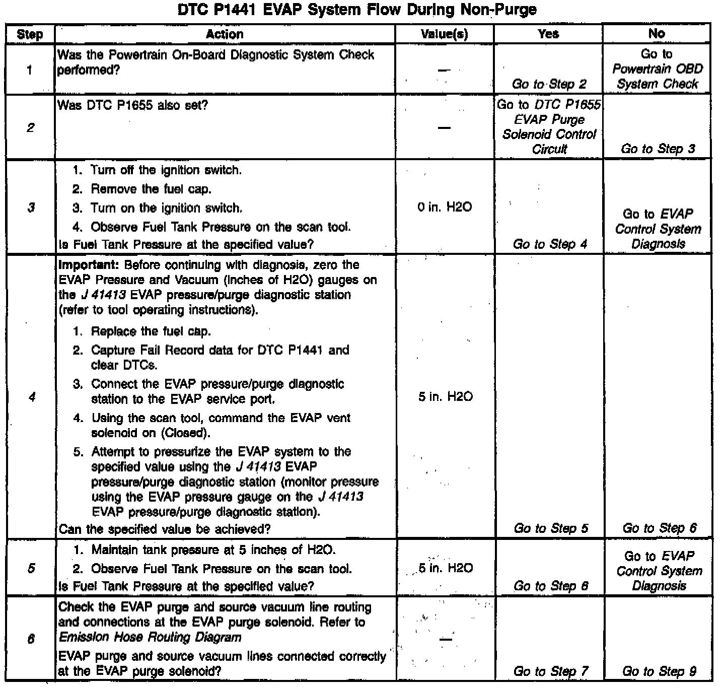 ^ If the harness appears to be OK, connect the J 41413 EVAP pressure/purge diagnostic station to the EVAP service port, pressurize the EVAP system to 10 in. H2O and observe the Fuel Tank Pressure display on the scan tool while moving connectors and wiring harnesses related to the EVAP purge solenoid. A sudden change in the display will indicate the location of the fault.