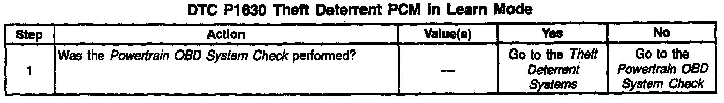 The Theft Deterrent system is incorporated within the Body Control Module (BCM). If the BCM has been replaced, the password must be relearned using approved Techline diagnostic equipment. If the PCM is replaced, the replacement PCM should relearn the password within a few seconds after the ignition is turned on. The engine will start and continue to run with DTC P1630 set.