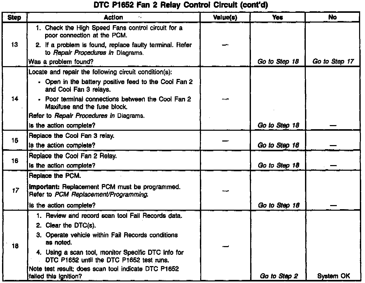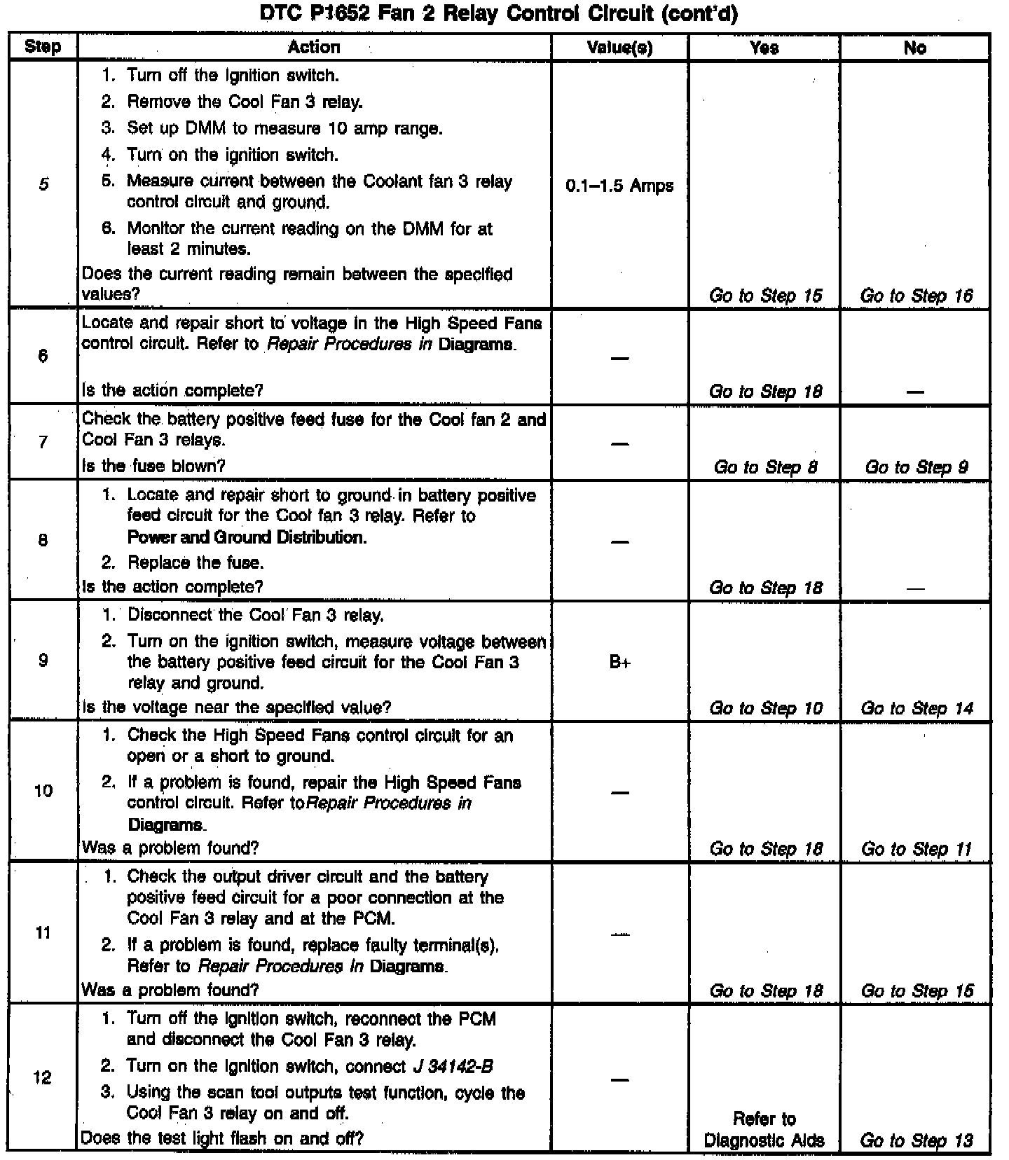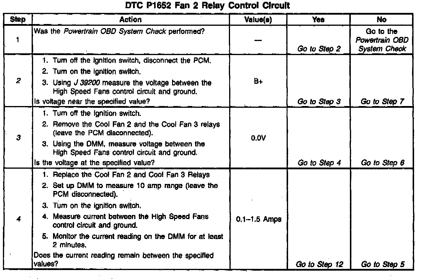 Output Driver Modules (ODMs) are used by the PCM to turn on many of the current-driven devices that are needed to control various engine and Transaxle functions. Each ODM is capable of controlling up to 7 separate outputs by applying ground to the device which the PCM is commanding on. Unlike the Quad Driver Modules (QDMs) used in prior model years, ODMs have the capability of diagnosing each output circuit individually. DTC P1652 set indicates an improper voltage level has been detected on ODM B output 2, which controls the Cool Fan 2 and Cool Fan 3 relays.