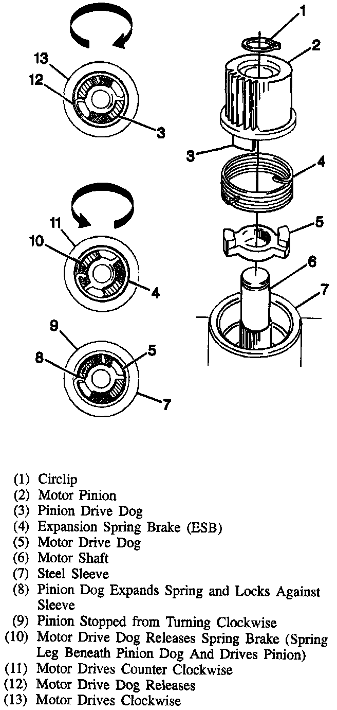 The Expansion Spring Brake (ESB) is used to hold the piston in the upmost (or home) position. An ESB is a spring that is retained in a housing at a close tolerance. One end of the spring is in contact with the motor drive dog and the other end is in contact with the pinion drive dog. In normal braking, brake pressure is present on the top of the piston, applying a downward force. The force applies a counterclockwise torque to the motor pinion which tries to rotate the spring counterclockwise. The counterclockwise torque expands the spring outward within the housing and prevents gear rotation.