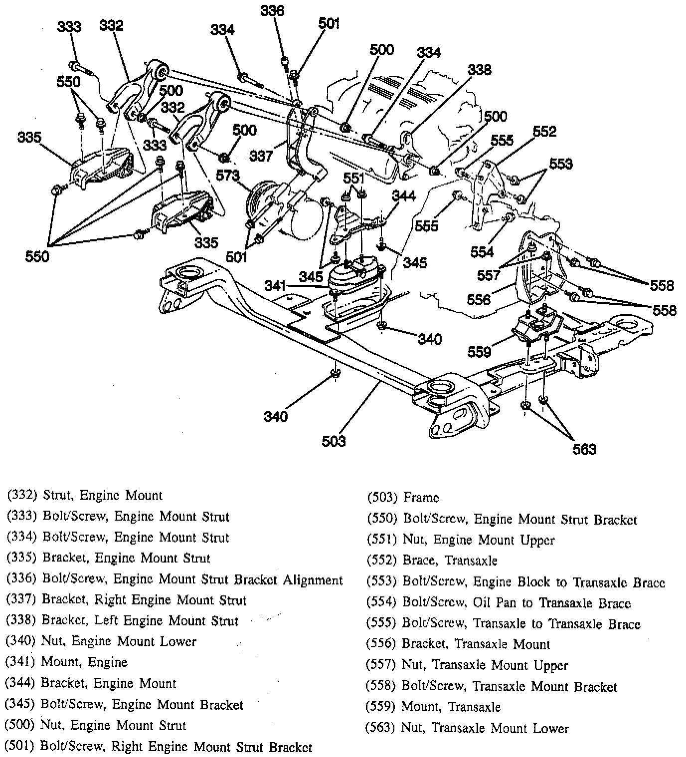 1. Transaxle mount to transaxle mount frame bracket.