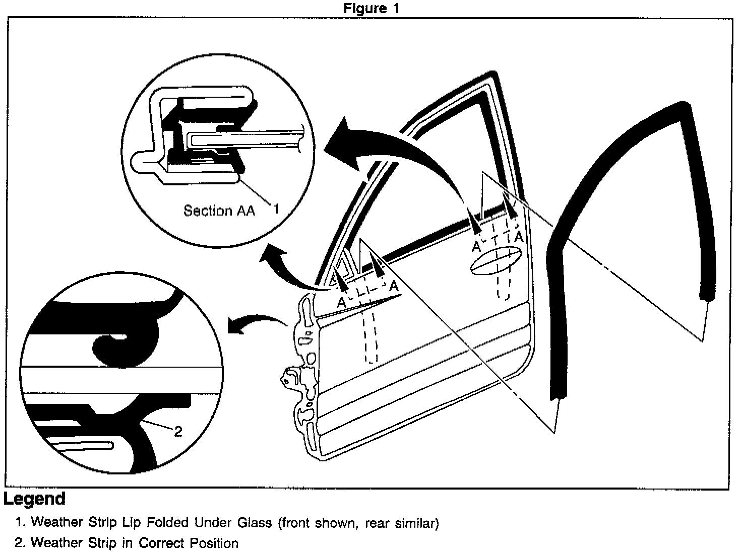 A. The glass run channel outboard lip at the mirror patch is rolled over or the glass run channel outboard lip at the "B" pillar is rolled over. See Figure 1, Item 1.