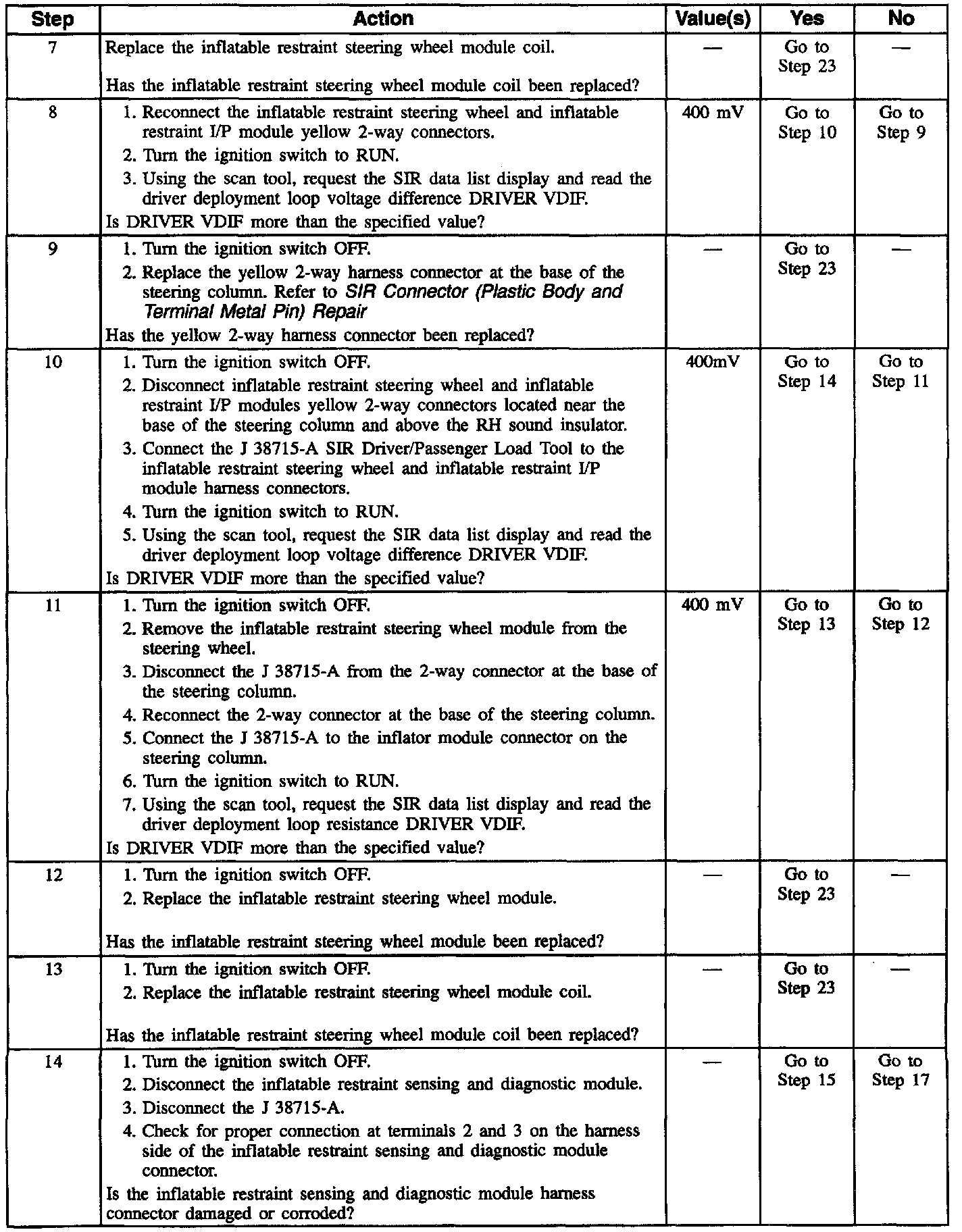 10. This test isolates the malfunction to one side of the inflatable restraint steering wheel module yellow 2-way connector located near the base of the steering column.