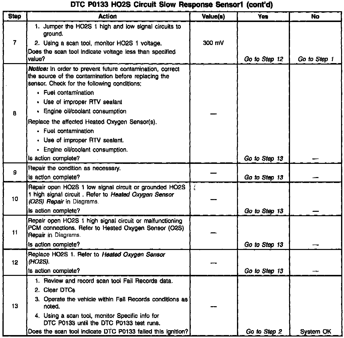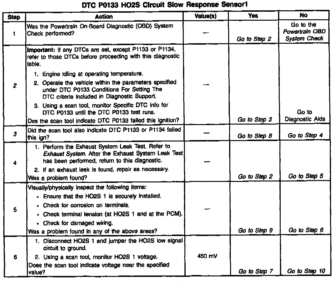 Inspect the wiring harness for damage. If the harness appears to be OK, observe the HO2S 1 display on the scan tool while moving connectors and wiring harnesses related to the sensor. A change in the display will indicate the location of the malfunction. If DTC P0133 cannot be duplicated, Reviewing the Fail Records vehicle mileage since the diagnostic test last failed may help determine how often the condition that caused the DTC to be set occurs. This may assist in diagnosing the condition.