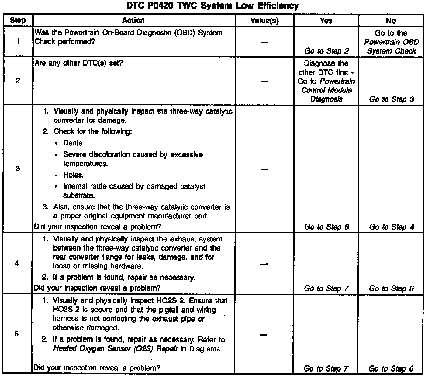 To control emissions of Hydrocarbons (HC), Carbon Monoxide (CO), and Oxides of Nitrogen (NOx), a three-way catalytic converter is used. The catalyst within the converter promotes a chemical reaction which oxidizes the HC and CO present in the exhaust gas, converting them into harmless water vapor and carbon dioxide. The catalyst also reduces NOx, converting it to nitrogen. The PCM has the ability to monitor this process using the HO2S 1 and the HO2S 2 heated oxygen sensors. The HO2S 1 sensor produces an output signal which indicates the amount of oxygen present in the exhaust gas entering the three-way catalytic converter. The HO2S 2 sensor produces an output signal which indicates the oxygen storage capacity of the catalyst; this in turn indicates the catalyst's ability to convert exhaust gases efficiently. If the catalyst is operating efficiently, the HO2S 1 signal will be far more active than that produced by the HO2S 2 sensor. If the PCM detects a level of HO2S 2 activity that indicates the catalyst is no longer operating efficiently, DTC P0420 will be set.