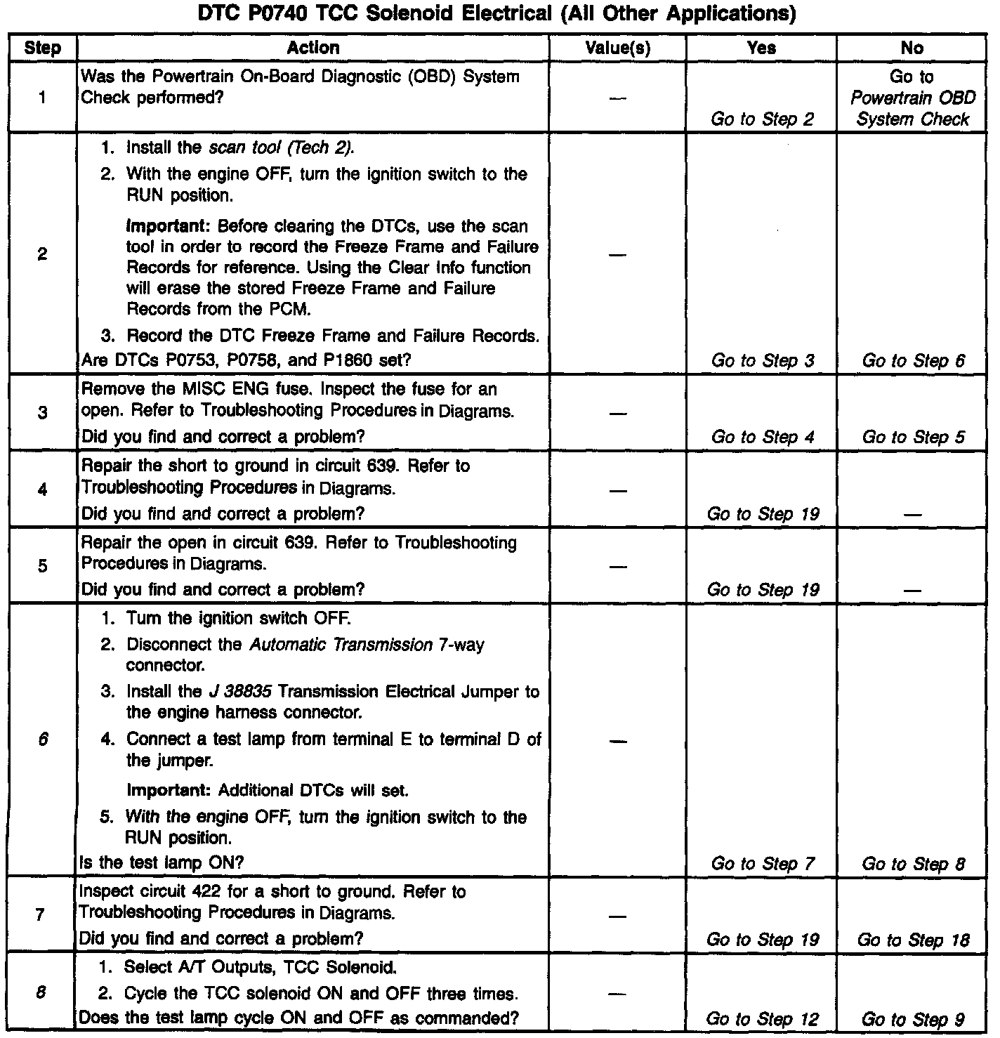 If the PCM detects low voltage when the TCC Sol. Valve is commanded OFF or high voltage when the TCC Sol. Valve is commanded ON, then DTC P0740 sets. DTC P0740 is a type A DTC.