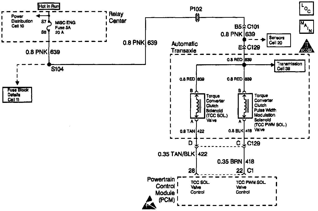 In conjunction with the Torque Converter Clutch Pulse Width Modulation Solenoid Valve (TCC PWM Sol. Valve), the Torque Converter Clutch Solenoid Valve (TCC Sol. Valve) controls the fluid acting on the TCC converter clutch valve. This controls the TCC apply and release. The PCM monitors the throttle position, the vehicle speed and other inputs in order to determine when to energize the TCC Sol. Valve. Circuit 639 supplies ignition voltage directly to the TCC Sol. Valve. The PCM controls the TCC Sol. Valve by providing the ground path through circuit 422. When you command the TCC Sol. Valve OFF, the PCM receives high voltage. When you command the TCC Sol. Valve ON. the PCM receives low voltage.
