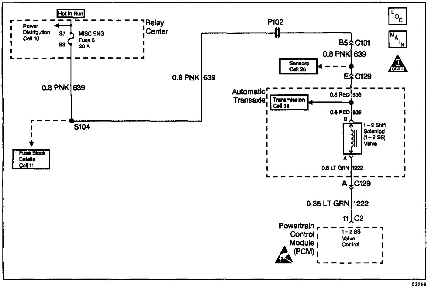 The 1-2 Shift Solenoid Valve (1-2 SS Valve) controls the transmission fluid pressure on the 1-2 shift valve. The MISC ENG fuse provides ignition voltage to the solenoid. The Output Driver Module (0DM), within the Powertrain Control Module (PCM), provides ground. The PCM monitors voltage levels at the 0DM. When you command the 1-2 SS Valve ON, the PCM receives low voltage. When you command the 1-2 SS Valve OFF, the PCM receives high voltage. DTC P0753 sets if the received voltage is outside the calibration limits. DTC P0753 is a type A DTC.