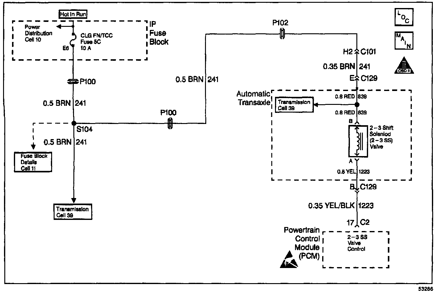 The 2-3 Shift Solenoid Valve (1-2 SS Valve) controls the transmission fluid pressure on the 2-3 shift valve. The CLG FN/TCC fuse provides ignition voltage to the solenoid. The Output Driver Module (0DM), within the Powertrain Control Module (PCM), provides ground. The PCM monitors voltage levels at the 0DM. When you command the 2-3 SS Valve ON, the PCM receives low voltage. When you command the 2-3 SS Valve OFF, the PCM receives high voltage. DTC P0758 sets if the received voltage is outside the calibration limits. DTC P0758 is a type A DTC.