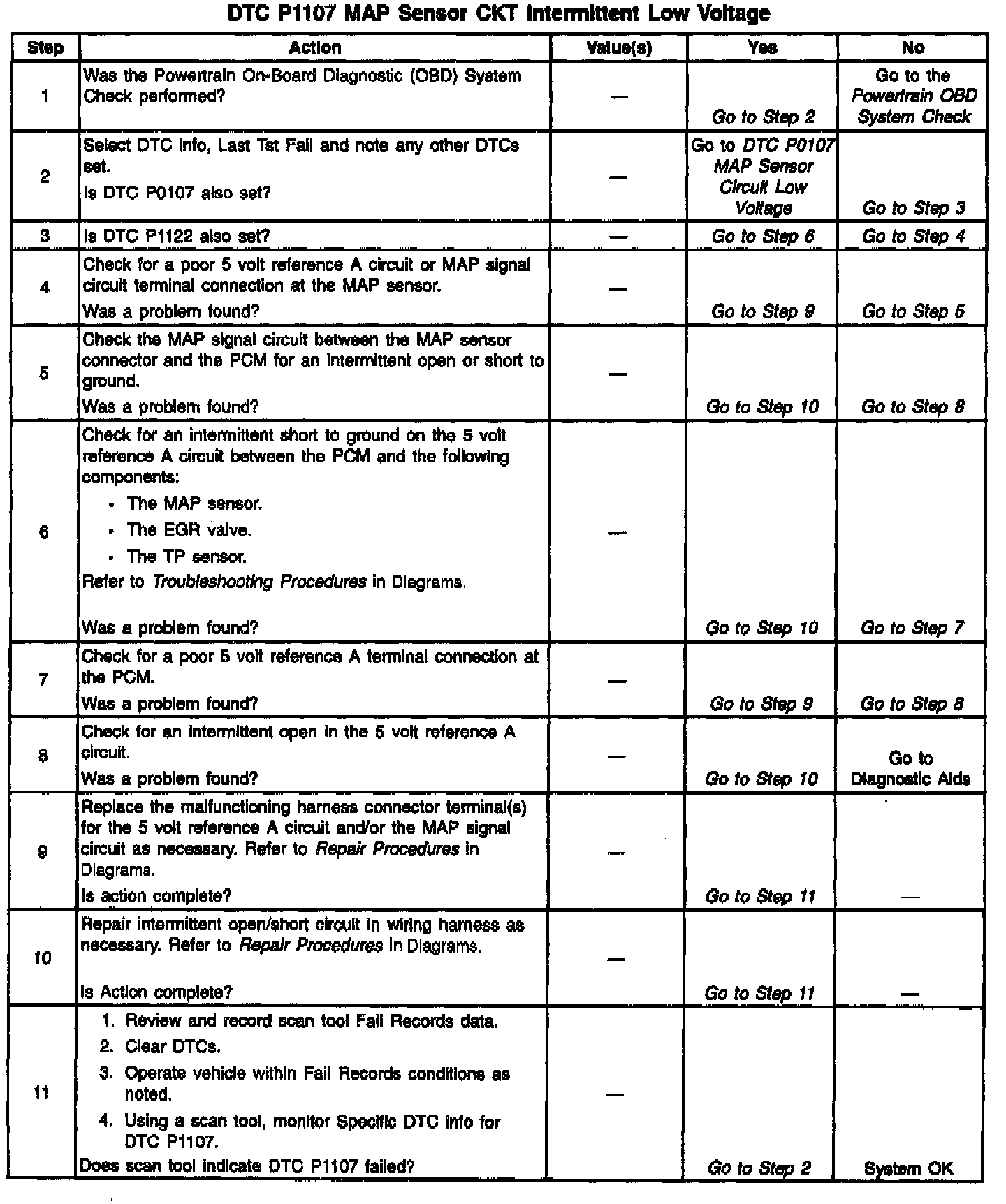 The Manifold Absolute Pressure (MAP) sensor responds to changes in intake manifold pressure (vacuum). The MAP sensor signal voltage to the PCM varies from below 2 volts at idle (high vacuum) to above 4 volts with the key ON, engine not running or at wide-open throttle (low vacuum). The MAP sensor is used to determine manifold pressure changes while the linear EGR flow test diagnostic is being run (refer to DTC P0401) P0401, to determine engine vacuum level for some other diagnostics and to determine barometric pressure (BARO). The PCM monitors the MAP signal for voltages outside the normal range of the MAP sensor. If the PCM detects a MAP signal voltage that is intermittently low, DTC P1107 will be set.