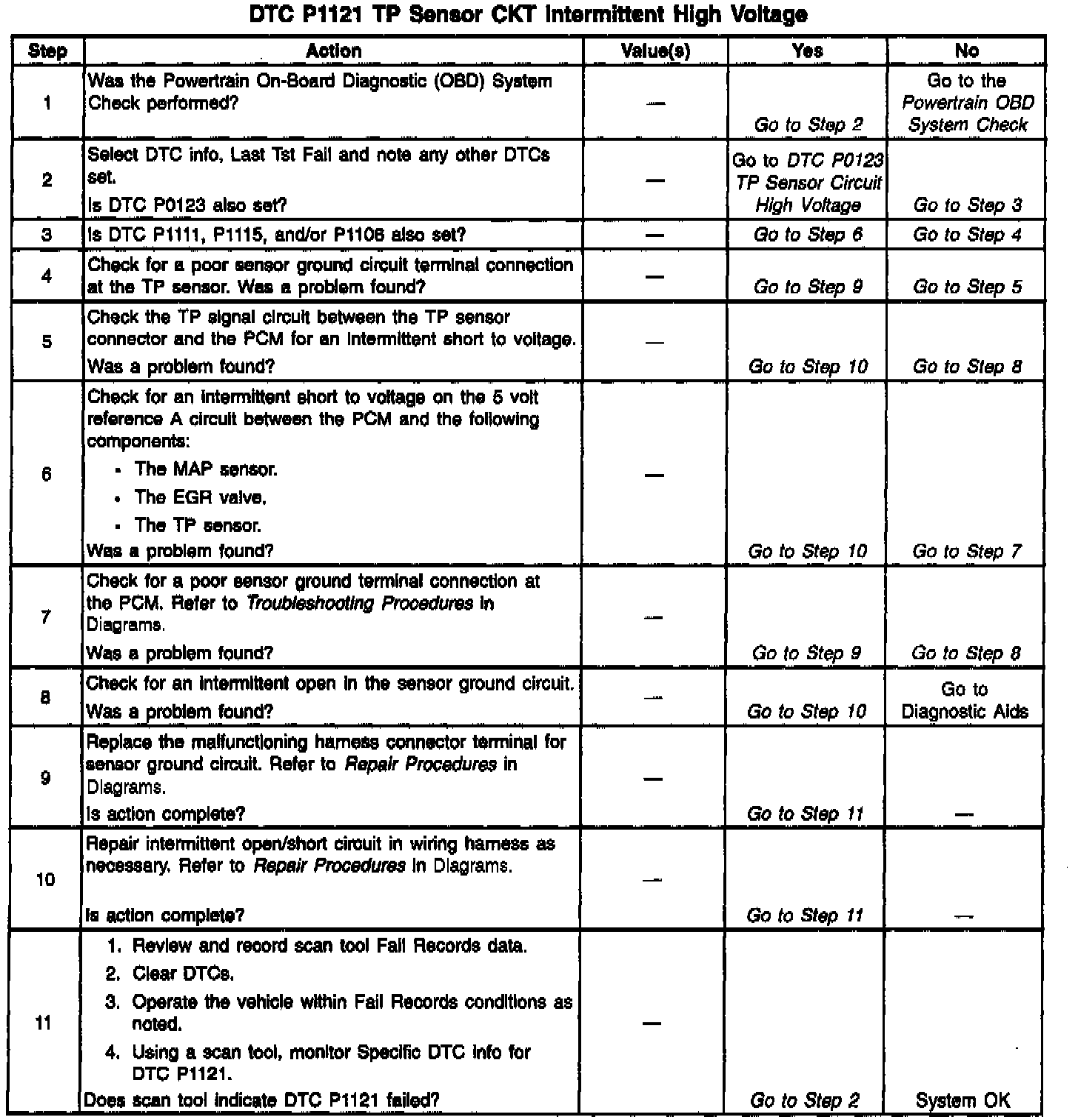 The Throttle Position (TP) sensor circuit provides a voltage signal that changes relative to throttle blade angle. The signal voltage will vary from 1 volt at closed throttle to 4 volts at Wide Open Throttle (WOT). The TP signal is one of the most important inputs used by the PCM for fuel control and most of the PCM-controlled outputs. If the PCM detects a TP signal voltage that is intermittently greater than the range of the TP sensor, DTC P1121 will be set.