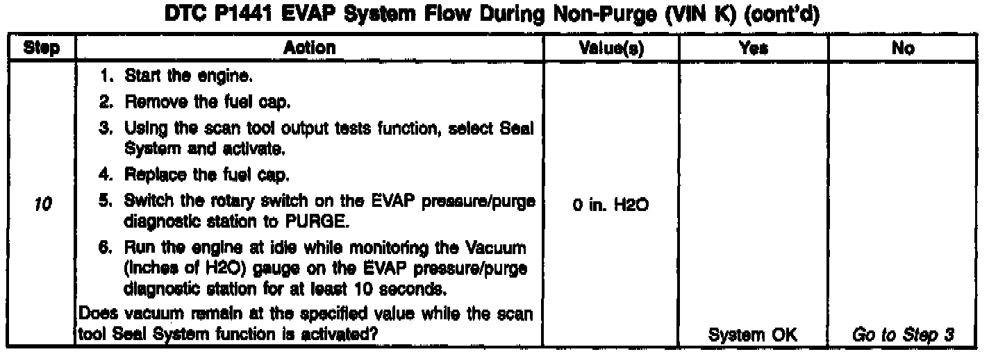 10. The PCM will command the EVAP purge and EVAP canister vent valves closed with the scan tool Seal System EVAP output control function activated. Fuel tank pressure should not decrease under this condition.