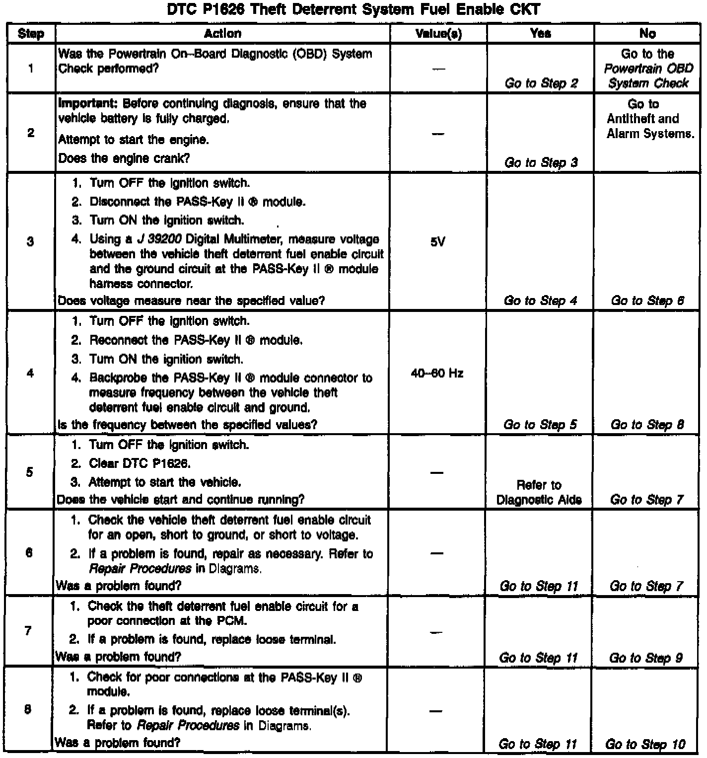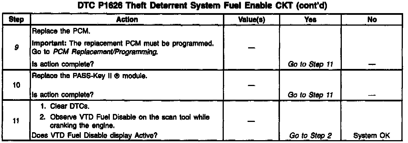 The PASS-Key II (R) module produces the Theft Deterrent Fuel Enable signal when ignition is ON and the proper key resistor pellet is sensed by the PASS-Key II (R) module. The PCM monitors the Fuel Enable signal during crank. If the proper signal is present on the Theft Deterrent Fuel Enable circuit, the PCM enables fuel delivery to allow the engine to start. If the PCM detects that the fuel enable signal is not present or incorrect while the engine is running, DTC P1626 will be set. The engine will continue to start and run as long as DTC P1626 is stored and the malfunction condition affects only the Theft Deterrent Fuel enable circuit. If the problem affects inputs to the PASS-Key II (R) module, the starter motor may be disabled. If this condition is present, refer to Antitheft and Alarm Systems for further diagnosis.