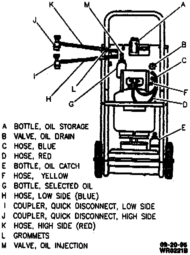 Connect high-side (red) and low-side (blue) hoses to the (ACR4) unit. Be sure to route hoses through hose reel bracket grommets.