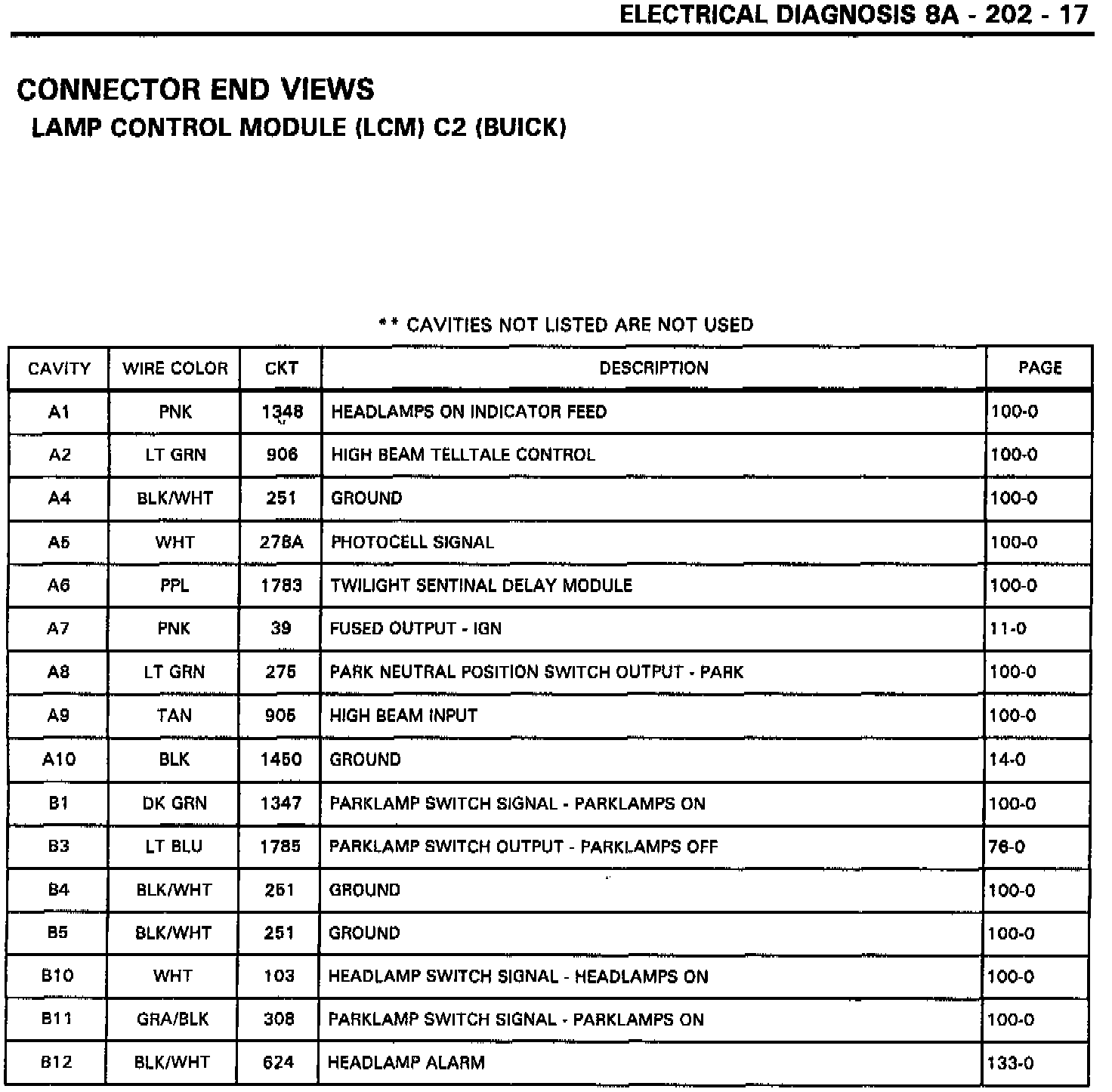 This bulletin is being issued to revise the Lamp Control Module Connector End View Pinout Table on Page 8A-202-17 of the Service Manual.