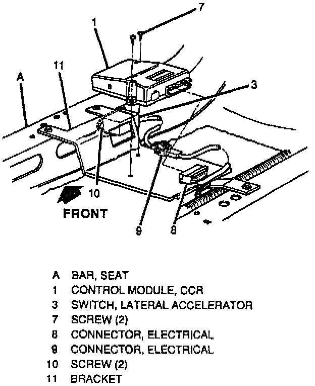 2. Cut carpet back under driver seat to expose control module (1)