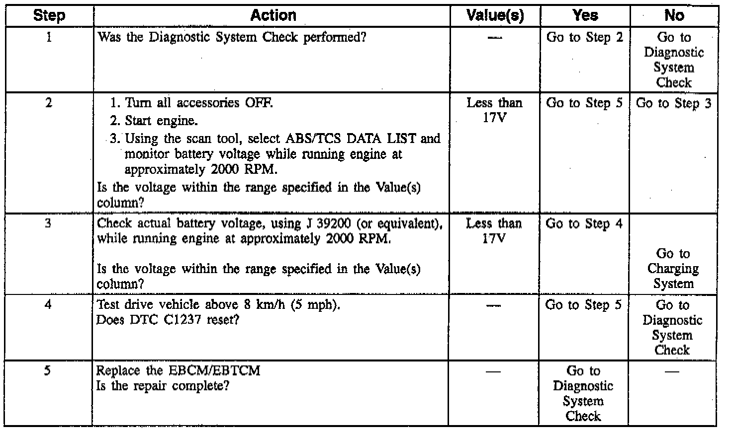Diagnostic Trouble Code (DTC) C1237 can only be set if the vehicle's speed is greater than 8 km/h (5 mph). If the battery voltage is greater than 17 volts, a malfunction exists.