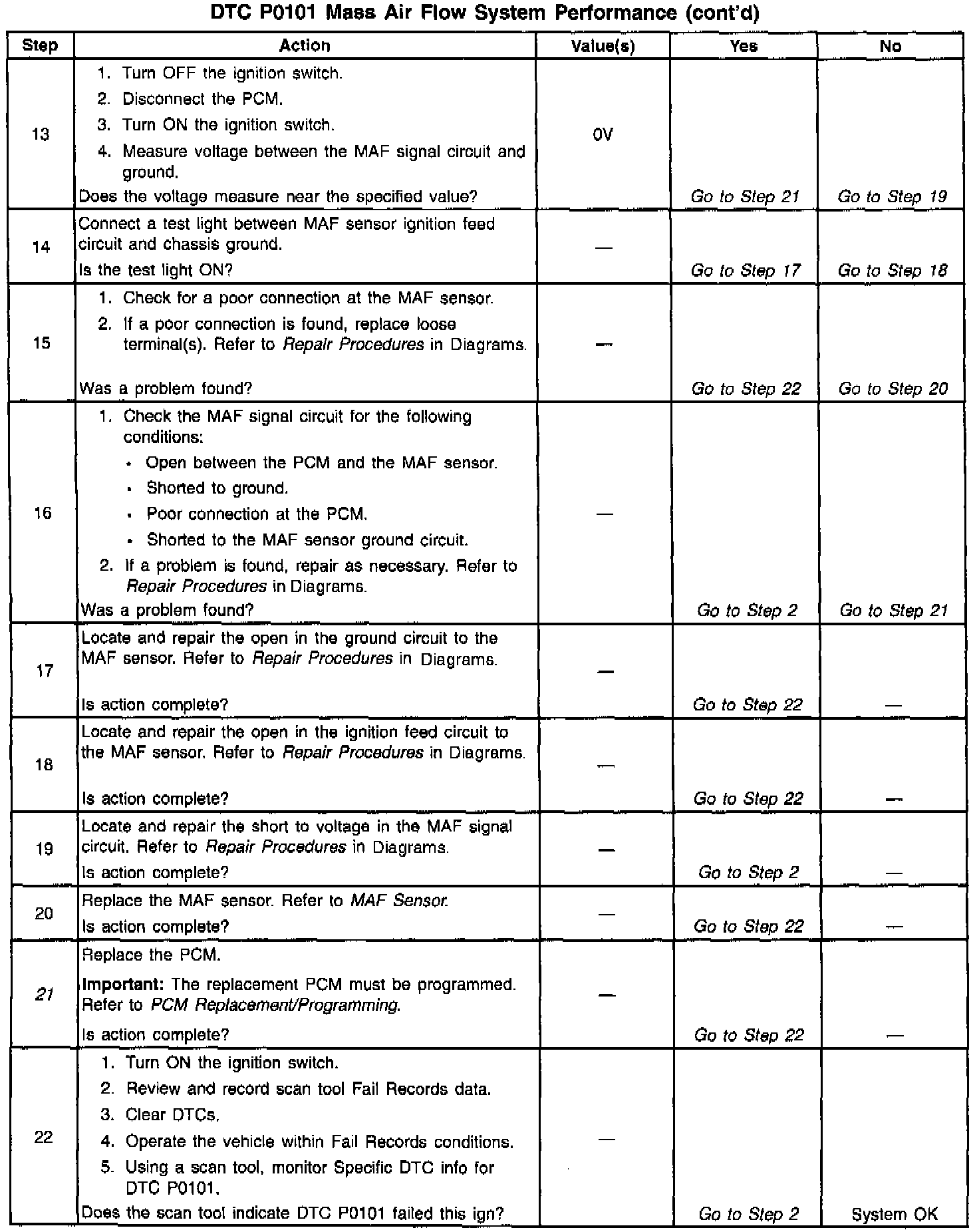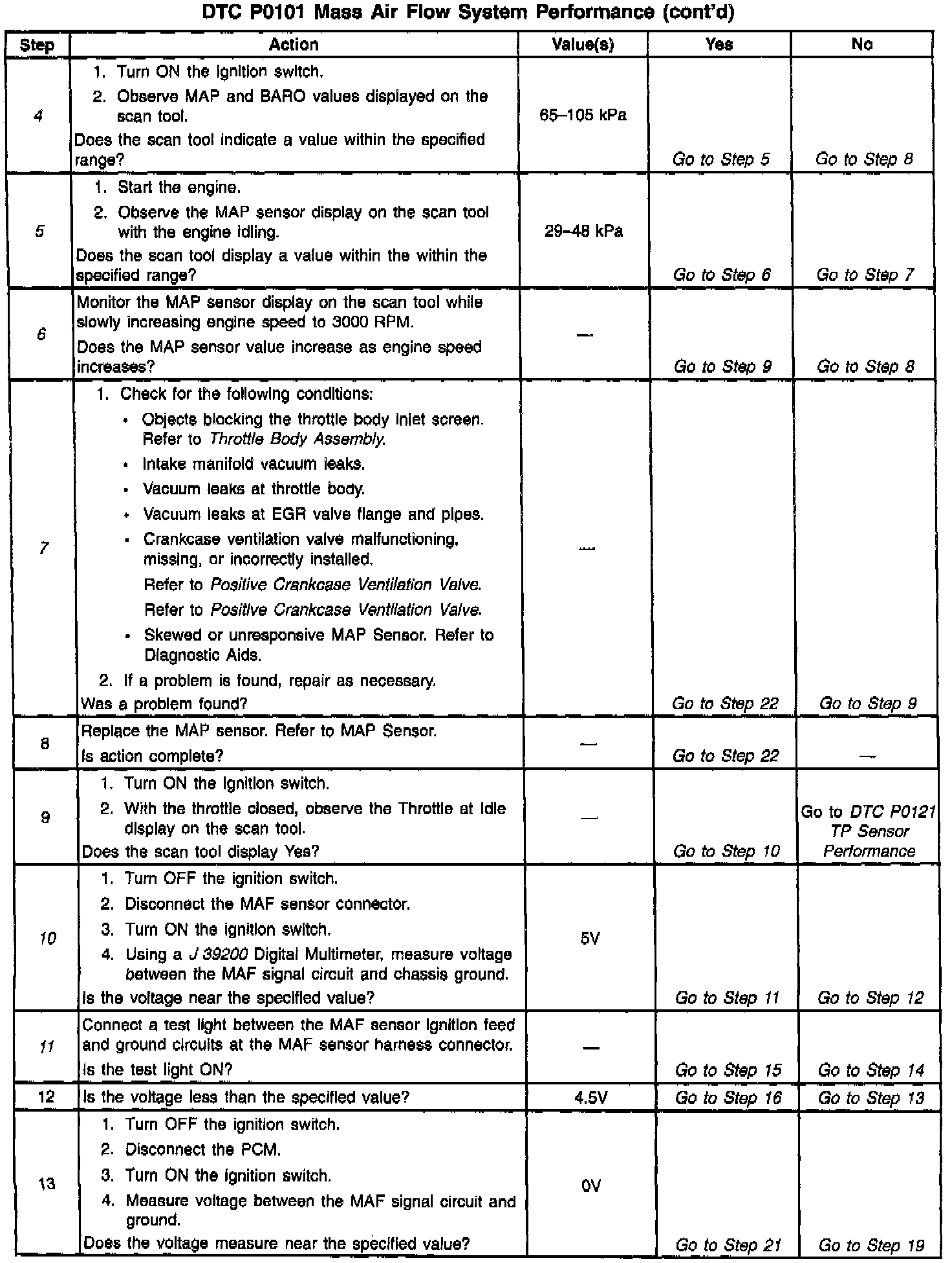 4. This step verifies a proper MAP/BARO value at initial key ON. If the MAP sensor is stuck the barometric pressure value will be incorrectly calculated. This will cause the predicted Mass Air Flow calculations to be inaccurate. DTC P0101 will set if the MAF sensor signal does not match the predicted MAF value.