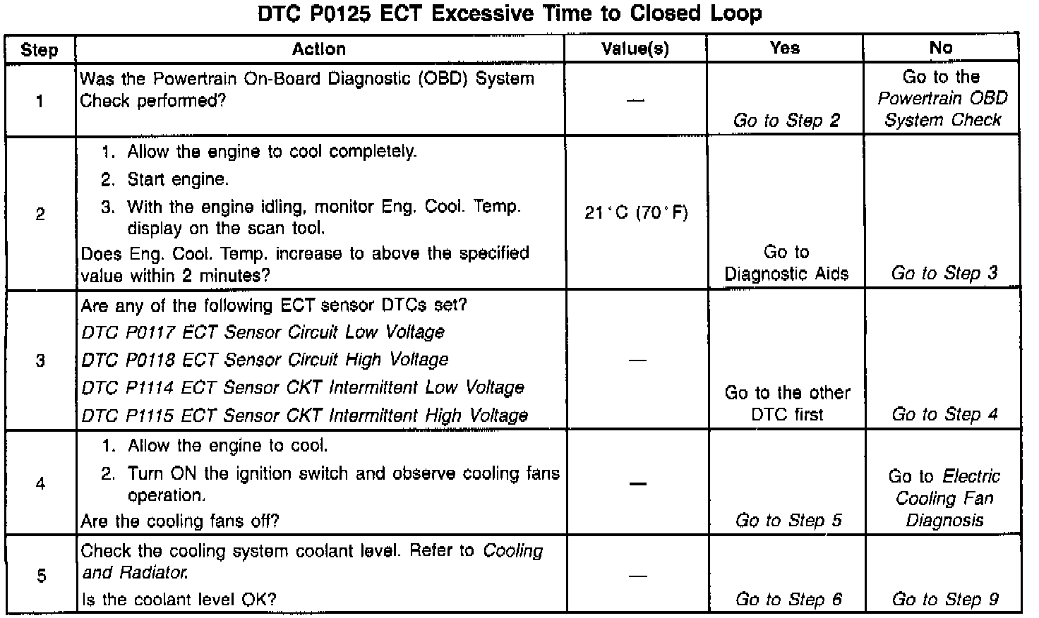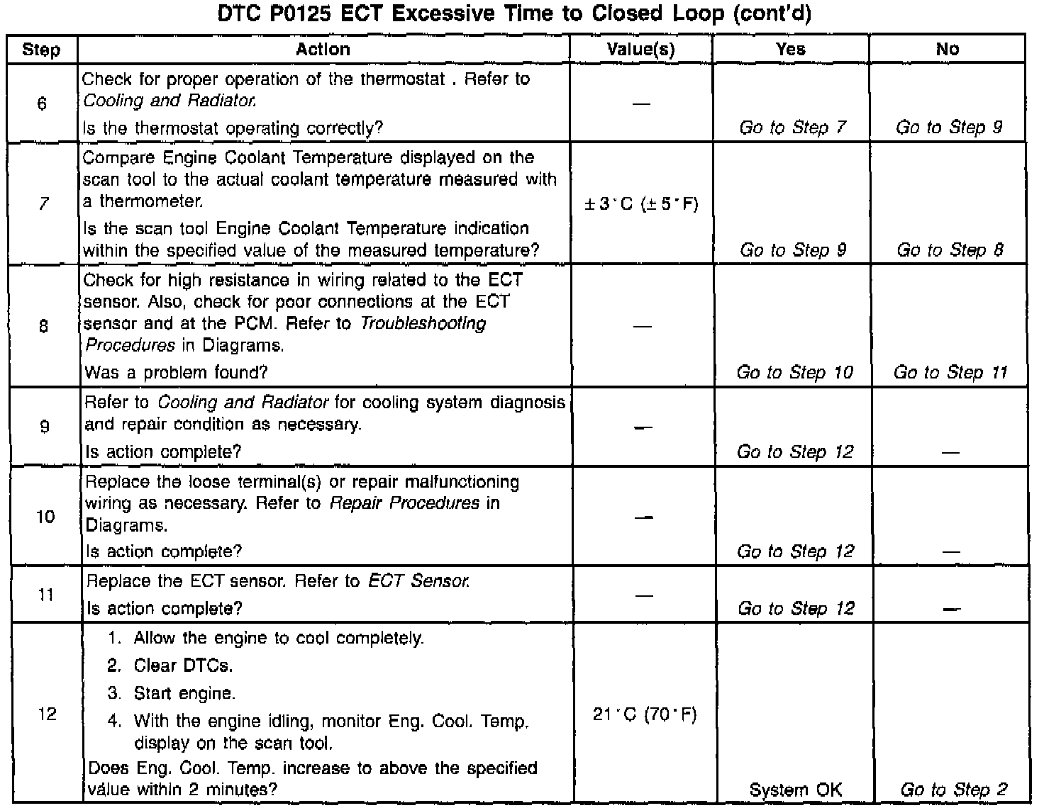 ^ DTC P0125 set indicates a skewed ECT sensor. Comparing the engine coolant temperature displayed on a scan tool with actual coolant temperature measured with a thermometer may isolate this condition. If the displayed engine coolant temperature is not close to the actual coolant temperature, replace the ECT sensor.