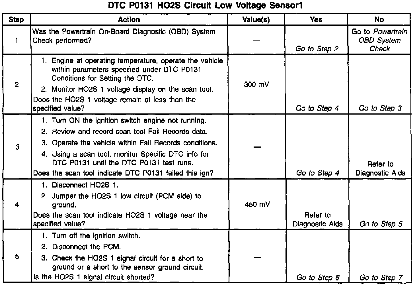 The PCM supplies a bias voltage of about 450mV between the HO2S signal and low circuits. When measured with a 10 megohm digital voltmeter, this may display as low as 350mV. The oxygen sensor varies the voltage within a range of about 1000mV when the exhaust is rich, down through about 100mV when exhaust is lean. The PCM constantly monitors the HO2S signal during closed loop operation and compensates for a rich or lean condition by decreasing or increasing injector pulse width as necessary. If the HO2S 1 voltage remains excessively low for an extended period of time, DTC P0131 will be set.