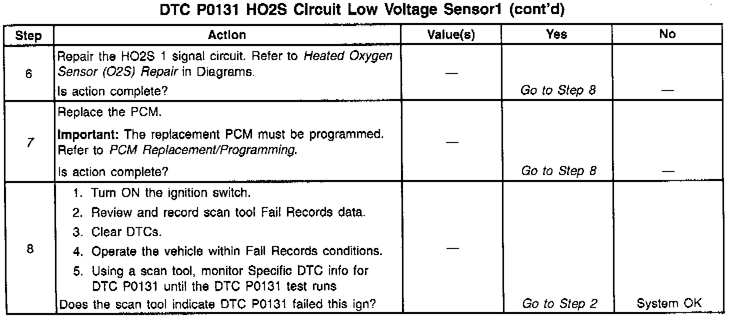 3. DTC P0131 failing during power enrichment operation (TP angle above 60%) may indicate a condition described in Diagnostic Aids. If the DTC P0131 test passes while the Fail Records conditions are being duplicated an intermittent condition is indicated. Reviewing the Fail Records vehicle mileage since the diagnostic test last failed may help determine how often the condition that caused the DTC to be set occurs This may assist in diagnosing the condition.
