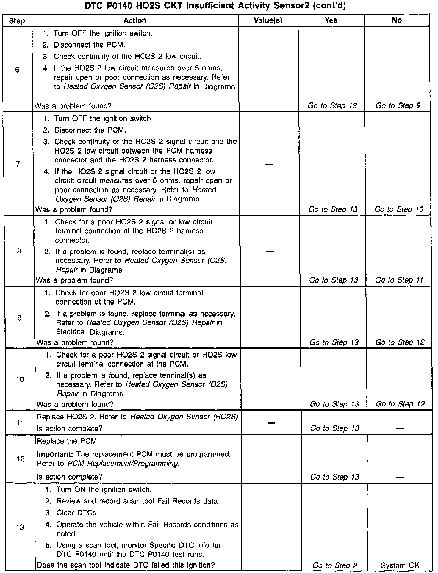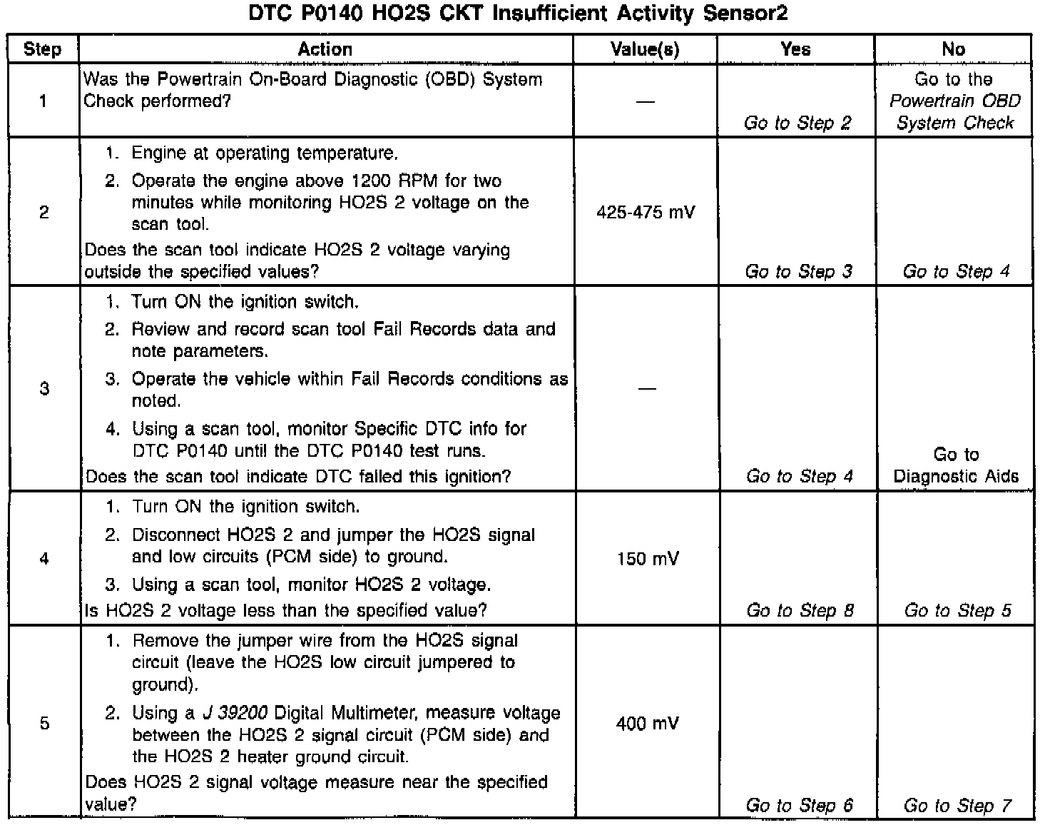 The PCM supplies a bias voltage of about 450 mV between the HO2S signal and low circuits. When measured with a 10 megohm digital voltmeter, this may display as low as 320 mV. The oxygen sensor varies the voltage within a range of about 1000 mV when the exhaust is rich, down through about 10 mV when exhaust is lean. The PCM constantly monitors the HO2S signal during closed loop operation and compensates for a rich or lean condition by decreasing or increasing injector pulse width as necessary. If the HO2S 2 voltage remains at or near the 450 mV bias for an extended period of time, DTC P0140 will be set, indicating an open sensor signal or sensor low circuit.