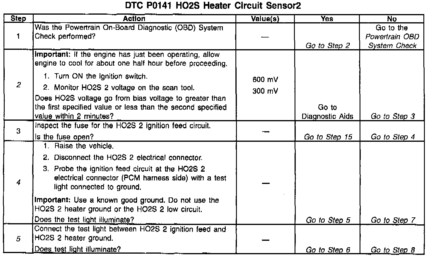 2. The HO2S should be allowed to cool before performing this test. If the HO2S heater is functioning, the signal voltage will gradually increase or decrease as the sensor element warms. If the heater is not functioning the HO2S signal will remain near the 450 mv bias voltage.