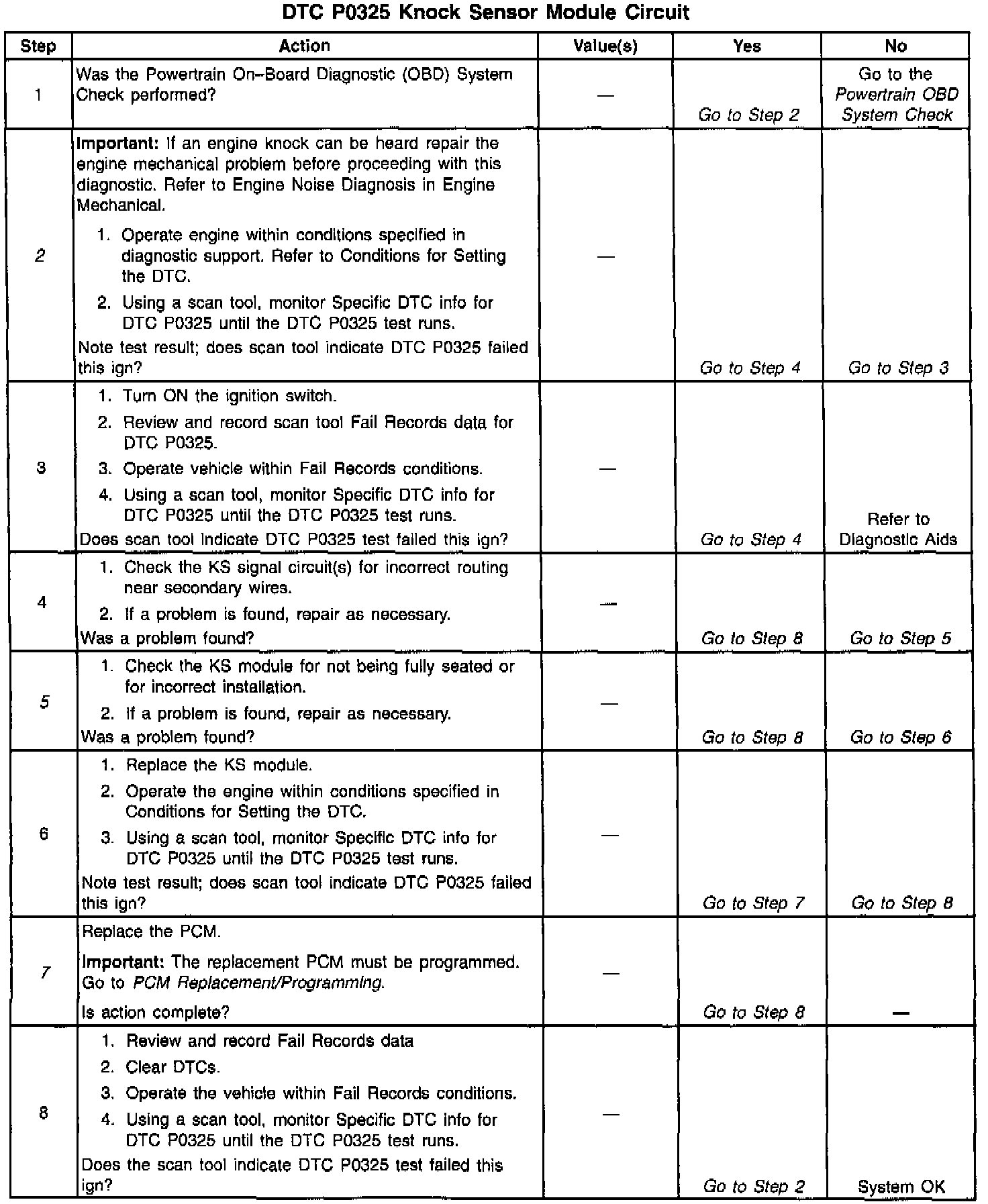 The PCM determines whether the knock sensors and related wiring are operating properly by monitoring the voltage level on the noise channel. The noise channel allows the PCM to diagnose the KS system by allowing the PCM to learn the amount of normal engine mechanical noise present. Normal engine noise varies depending on engine speed and load. Normal engine noise varies depending on engine speed and load. The PCM contains a replaceable Knock Sensor (KS) module. The KS module contains the circuitry that allows the PCM to diagnose the KS sensors and circuitry. If the KS module is missing or malfunctioning causing a continuous knock condition to be indicated, the PCM will set DTC P0325.