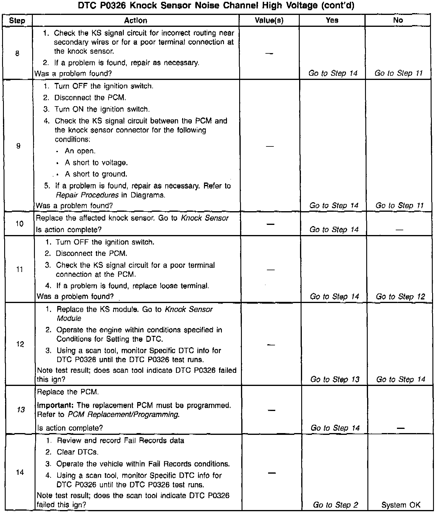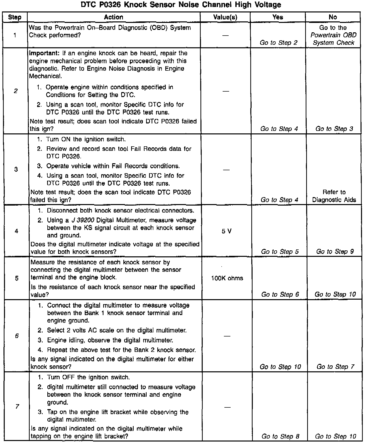 The PCM determines whether the knock sensors and related wiring are operating properly by monitoring the voltage level on the noise channel. The noise channel allows the PCM to diagnose the KS system by allowing the PCM to learn the amount of normal engine mechanical noise present. Normal engine noise varies depending on engine speed and load. When the PCM determines that an abnormally high noise channel voltage level is being experienced, a DTC P0326 will set.