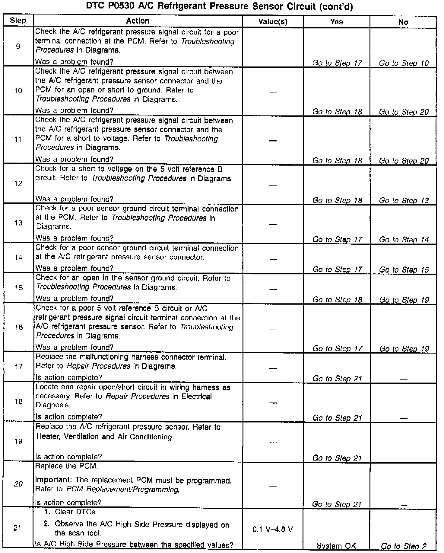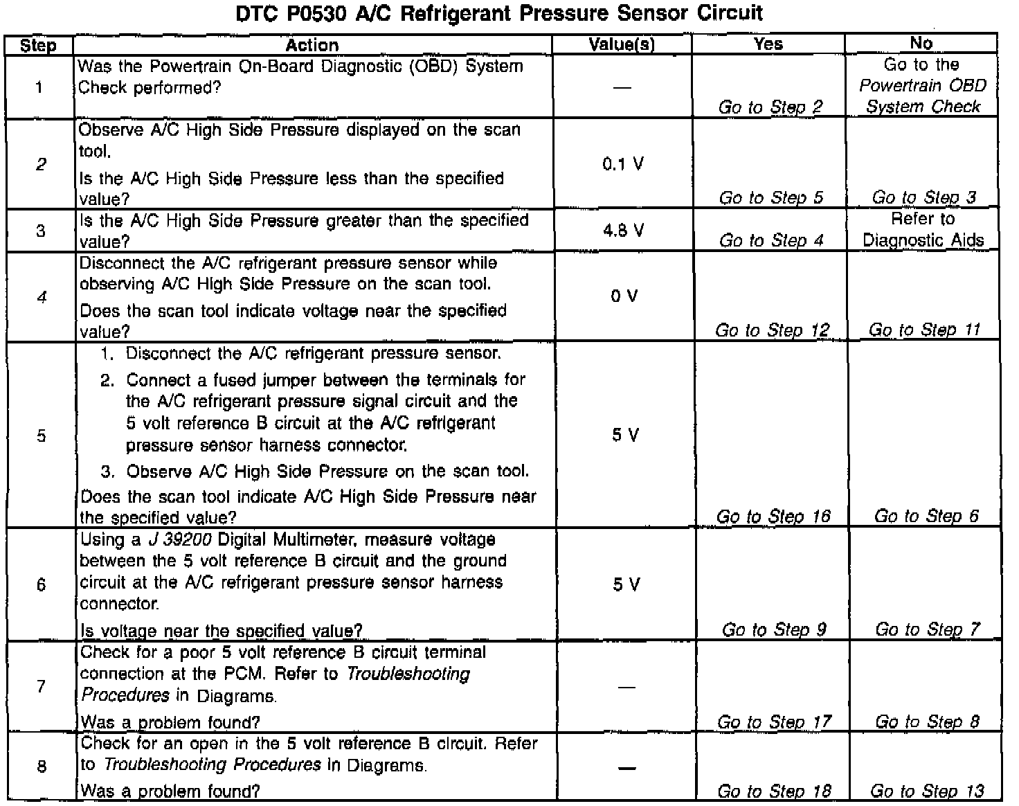 2. Normal A/C refrigerant pressure sensor signal voltage is between 0.1 and 4.8 volts. If A/C voltage is within range, review Fail Records data to determine the conditions that were present when DTC P0530 set.