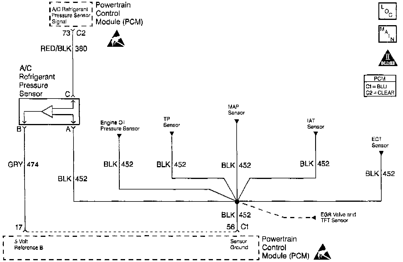 4. If the A/C refrigerant pressure signal voltage stays high after disconnecting the A/C refrigerant pressure sensor electrical connector, the signal circuit is shorted to voltage or the PCM is malfunctioning.