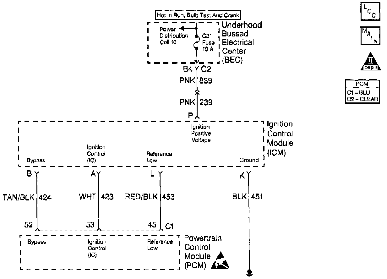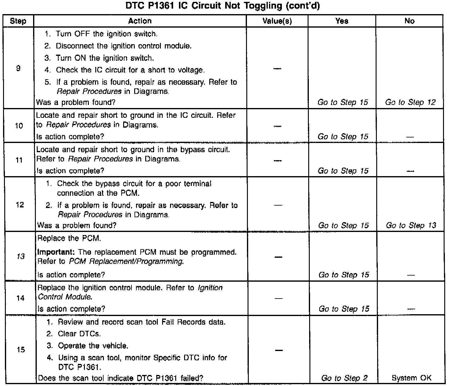 The Ignition Control Module (ICM) sends signals that the PCM requires for fuel control and spark advance calculations. At the start of engine crank, the ICM controls spark advance (Bypass mode). When the second 3X reference pulse is recognized by the PCM, the PCM applies 5 volts to the Bypass circuit. The 5 volts on the Bypass circuit commands the ICM to switch spark advance to PCM control (IC mode). At this time, The ICM will remove the ground it has applied to the IC circuit. When the IC pulses are not grounded, the ICM can use the IC pulses to control spark advance. A short in the IC circuit or an open or short to ground in the Bypass circuit will cause the PCM to monitor no IC pulses after the PCM has switched the Bypass circuit ON. The PCM will set DTC P1361 under either of these conditions. The engine may be started but will run on Bypass mode timing.